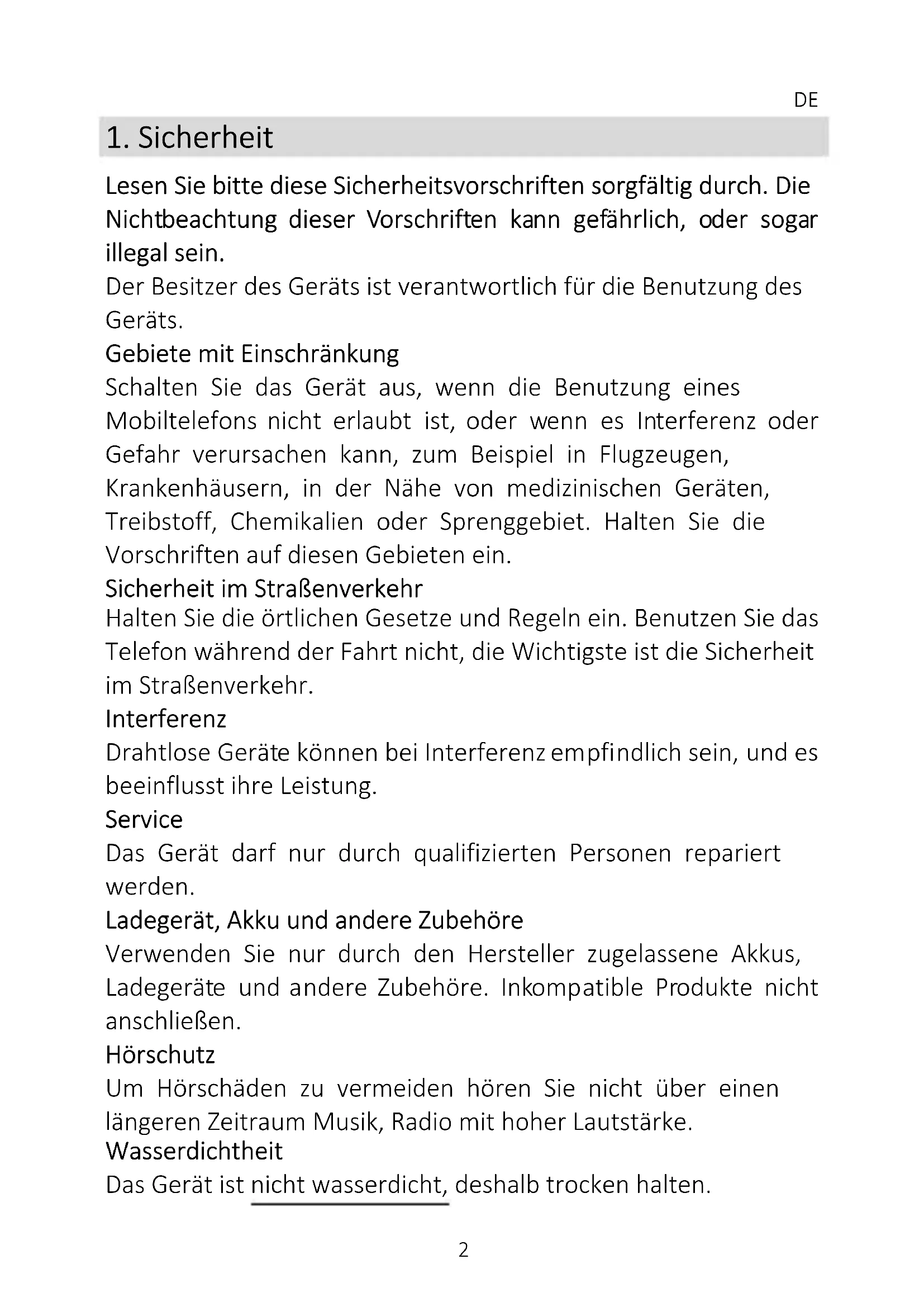 Lesen Sie bitte diese Sicherheitsvorschriften sorgfältig durch. Die Nichtbeachtung dieser Vorschriften kann gefährlich, oder sogar illegal sein. Der Besitzer des Geräts ist verantwortlich für die Benutzung des Geräts. Gebiete mit Einschränkung Schalten Sie das Gerät aus, wenn die Benutzung eines Mobiltelefons nicht erlaubt ist, oder wenn es Interferenz oder Gefahr verursachen kann, zum Beispiel in Flugzeugen, Krankenhäusern, in der Nähe von medizinischen Geräten, Treibstoff, Chemikalien oder Sprenggebiet. Halten Sie die Vorschriften auf diesen Gebieten ein. Sicherheit im Straßenverkehr Halten Sie die örtlichen Gesetze und Regeln ein. Benutzen Sie das Telefon während der Fahrt nicht, die Wichtigste ist die Sicherheit im Straßenverkehr. Interferenz Drahtlose Geräte können bei Interferenz empfindlich sein, und es beeinflusst ihre Leistung. Service Das Gerät darf nur durch qualifizierten Personen repariert werden. Ladegerät, Akku und andere Zubehöre Verwenden Sie nur durch den Hersteller zugelassene Akkus, Ladegeräte und andere Zubehöre. Inkompatible Produkte nicht anschließen. Hörschutz Um Hörschäden zu vermeiden hören Sie nicht über einen längeren Zeitraum Musik, Radio mit hoher Lautstärke. Wasserdichtheit Das Gerät ist nicht wasserdicht, deshalb trocken halten.DE