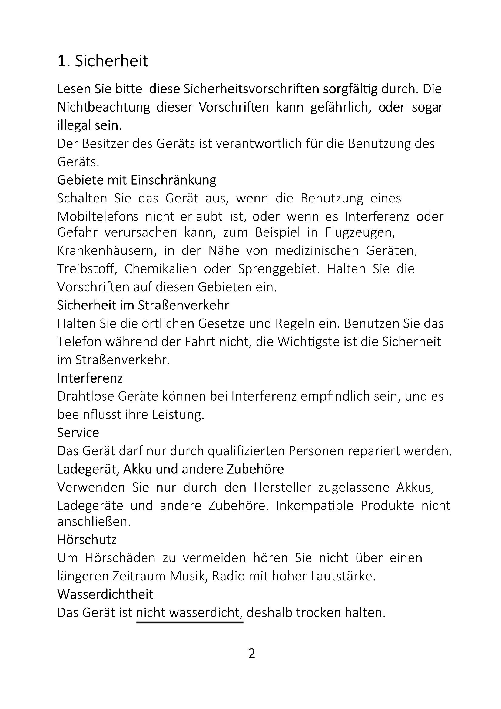 Lesen Sie bitte diese Sicherheitsvorschriften sorgfältig durch. Die Nichtbeachtung dieser Vorschriften kann gefährlich, oder sogar illegal sein. Der Besitzer des Geräts ist verantwortlich für die Benutzung des Geräts. Gebiete mit Einschränkung Schalten Sie das Gerät aus, wenn die Benutzung eines Mobiltelefons nicht erlaubt ist, oder wenn es Interferenz oder Gefahr verursachen kann, zum Beispiel in Flugzeugen, Krankenhäusern, in der Nähe von medizinischen Geräten, Treibstoff, Chemikalien oder Sprenggebiet. Halten Sie die Vorschriften auf diesen Gebieten ein. Sicherheit im Straßenverkehr Halten Sie die örtlichen Gesetze und Regeln ein. Benutzen Sie das Telefon während der Fahrt nicht, die Wichtigste ist die Sicherheit im Straßenverkehr. Interferenz Drahtlose Geräte können bei Interferenz empfindlich sein, und es beeinflusst ihre Leistung. Service Das Gerät darf nur durch qualifizierten Personen repariert werden. Ladegerät, Akku und andere Zubehöre Verwenden Sie nur durch den Hersteller zugelassene Akkus, Ladegeräte und andere Zubehöre. Inkompatible Produkte nicht anschließen. Hörschutz Um Hörschäden zu vermeiden hören Sie nicht über einen längeren Zeitraum Musik, Radio mit hoher Lautstärke. Wasserdichtheit Das Gerät ist nicht wasserdicht, deshalb trocken halten.3 Benutzungsumgebung Das Gerät entspricht den empfohlenen Werte der Radiowellen, wenn man es min. 1,5 cm entfernt von den Ohren hält. Wenn Sie das Telefon in Telefontasche, mit Gürtelschnalle oder auf einen Halter tragen, achten Sie darauf, dass diese kein Metall beinhalten und durch diese Sachen das Telefon ein wenig von Ihrem Körper fern gehalten wird. Bei Benutzung von anderen Zubehören kann die Funktion entsprechend dem Radiofrequenzsprinzip nicht gesichert werden. Wenn Sie keine Telefontasche benutzen und das Telefon nicht zu den Ohren halten, halten Sie das Gerät mindestens 2,5 cm entfernt von Ihrem Körper, besonders im Fall von Datenübertragung.