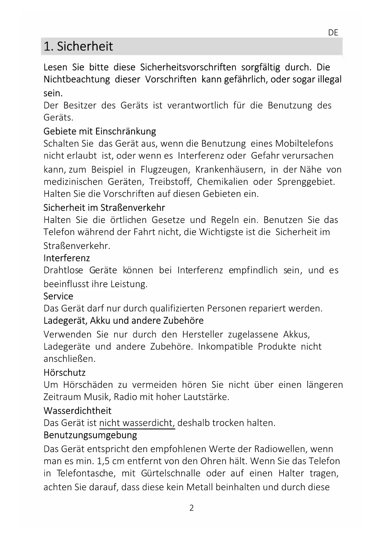 Lesen Sie bitte diese Sicherheitsvorschriften sorgfältig durch. Die Nichtbeachtung dieser Vorschriften kann gefährlich, oder sogar illegal sein. Der Besitzer des Geräts ist verantwortlich für die Benutzung des Geräts. Gebiete mit Einschränkung Schalten Sie das Gerät aus, wenn die Benutzung eines Mobiltelefons nicht erlaubt ist, oder wenn es Interferenz oder Gefahr verursachen kann, zum Beispiel in Flugzeugen, Krankenhäusern, in der Nähe von medizinischen Geräten, Treibstoff, Chemikalien oder Sprenggebiet. Halten Sie die Vorschriften auf diesen Gebieten ein. Sicherheit im Straßenverkehr Halten Sie die örtlichen Gesetze und Regeln ein. Benutzen Sie das Telefon während der Fahrt nicht, die Wichtigste ist die Sicherheit im Straßenverkehr. Interferenz Drahtlose Geräte können bei Interferenz empfindlich sein, und es beeinflusst ihre Leistung. Service Das Gerät darf nur durch qualifizierten Personen repariert werden. Ladegerät, Akku und andere Zubehöre Verwenden Sie nur durch den Hersteller zugelassene Akkus, Ladegeräte und andere Zubehöre. Inkompatible Produkte nicht anschließen. Hörschutz Um Hörschäden zu vermeiden hören Sie nicht über einen längeren Zeitraum Musik, Radio mit hoher Lautstärke. Wasserdichtheit Das Gerät ist nicht wasserdicht, deshalb trocken halten. Benutzungsumgebung Das Gerät entspricht den empfohlenen Werte der Radiowellen, wenn man es min. 1,5 cm entfernt von den Ohren hält. Wenn Sie das Telefon in Telefontasche, mit Gürtelschnalle oder auf einen Halter tragen, achten Sie darauf, dass diese kein Metall beinhalten und durch dieseDE