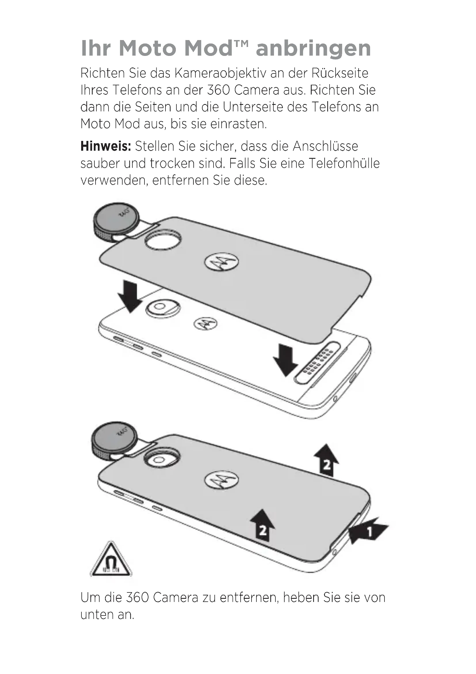 - Bearbeiten: Önen Sie ein Bild und tippen Sie auf oder önen Sie ein Video und tippen Sie auf . Bearbeitungsoptionen werden am unteren Bildschirmrand angezeigt.Bearbeitungsoptionen für 360-Foto Um diese Optionen anzuzeigen, tippen Sie auf . Zuschneiden Schneiden Sie ein 360°- Foto in ein flaches Foto mit Standardgröße zu. Wählen Sie eine Standardgröße oder benutzerdefinierte Abmessungen aus. Außerdem steht Ihnen der Eekt „Kleiner Planet“ zur Verfügung. 360-Zuschnitt Schneiden Sie ein 360°-Foto in ein intensives 360°-Foto zu. Wählen Sie dazu einfach den gewünschten Bereich aus. Filter Wählen Sie aus einer Vielzahl von Filtern aus. Anpassen Manuelle Anpassung von Belichtung, Kontrast, Sättigung und Farbtonstufen.Bearbeitungsoptionen für 360-Video Um diese Optionen anzuzeigen, tippen Sie auf . Schneiden Schneiden Sie die Länge des Videos. Erstellen Erstellen Sie ein einzelnes Video aus mehreren 360°-Videos. Director's Cut Wählen Sie die beeindruckendsten Teile eines 360°-Videos aus und bearbeiten Sie sie zusammen in einem normalen, nicht interaktiven 16:9-Video, das von jedem angezeigt werden kann. Aufnehmen Nehmen Sie ein Einzelbild des Videos als Foto auf, entweder 360° oder flach. Sie möchten mehr? Unter www.motorola.com/mymotomods finden Sie Tutorials, Videos und vieles mehr.Urheberrecht und Warenzeichen Motorola Mobility LLC 222 W. Merchandise Mart Plaza Chicago, IL 60654 www.motorola.com Bestimmte Funktionen, Dienste und Anwendungen sind netzwerkabhängig und u. U. nicht in allen Regionen verfügbar. Es können zusätzliche Bedingungen, Bestimmungen und/oder Änderungen gelten. Weitere Informationen erhalten Sie von Ihrem Mobilfunkanbieter. Alle Funktionen, Funktionalitäten und andere Produktspezifikationen sowie die in diesem Handbuch enthaltenen Informationen basieren auf den neuesten verfügbaren Informationen, die zum Zeitpunkt des Drucks für korrekt befunden wurden. Motorola behält sich das Recht vor, Informationen oder Spezifikationen ohne Ankündigung oder Verpflichtungen zu ändern. Hinweis: Die Bilder in diesem Handbuch sind lediglich Beispiele. MOTOROLA, das Logo mit dem stilisierten M, MOTO und die MOTO- Markenfamilie sind Marken oder eingetragene Marken von Motorola Trademark Holdings, LLC. LENOVO ist eine Marke von Motorola. Google, Android, Google Play und andere Marken sind Marken von Google Inc. Das microSD-Logo ist eine Marke von SD-3C, LLC. Alle sonstigen Produkt- oder Dienstleistungsnamen sind das Eigentum ihrer jeweiligen Inhaber. © 2017 Motorola Mobility LLC. Alle Rechte vorbehalten. Produkt-ID: Moto Mods 360 Camera (MD100S) Handbuchnummer: SSC8C19882-A360 CAMERA360 CAMERA Collegamento di Moto Mod™ Allineate l'obiettivo della fotocamera sul retro del telefono con 360 Camera, quindi allineate i lati e la parte inferiore del telefono con Moto Mod fino a farli scattare in posizione. Nota: verificate che i connettori siano asciutti e puliti. Inoltre, rimuovete l'eventuale custodia del telefono. MD100S Per rimuovere 360 Camera, sollevatelo dal fondo. Attenzione: non rimuovete 360 Camera aerrando l'obiettivo, poiché ciò potrebbe danneggiare il dispositivo.Rimozione del copriobiettivo Per rimuovere il copriobiettivo, sollevatelo e ruotatelo. Attenzione: per evitare gra all'obiettivo, tenete sempre il copriobiettivo quando non utilizzate la fotocamera e non posizionate la fotocamera su un tavolo o su una superficie piana, a meno che il copriobiettivo sia installato. Accensione della fotocamera Potete accendere la fotocamera in diversi modi: