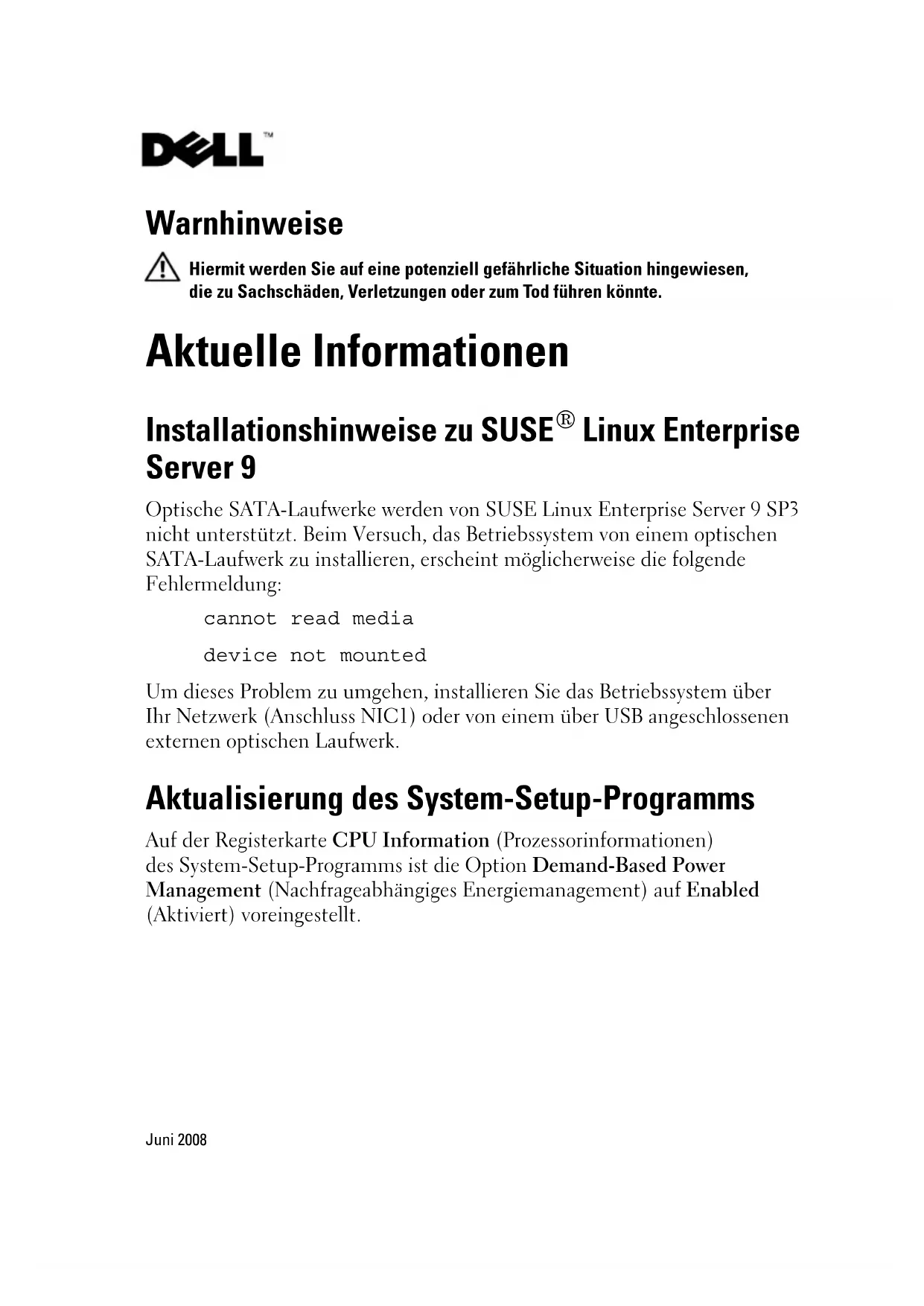 Irrtümer und technische Änderungen vorbehalten. © 2007-2008 Dell Inc. Alle Rechte vorbehalten. Gedruckt in Malaysia. Nachdrucke jeglicher Art ohne die vorherige schriftliche Genehmigung von Dell Inc. sind strengstens untersagt. In diesem Text verwendete Marken: Dell und das DELL-Logo sind Marken der Dell Inc.; SUSE ist eine eingetragene Marke von Novell, Inc. in den USA und anderen Ländern. Alle anderen in dieser Dokumentation genannten Marken und Handelsbezeichnungen sind Eigentum der jeweiligen Hersteller und Firmen. Dell Inc. erhebt keinen Anspruch auf Besitzrechte an Marken und Handelsbezeichnungen mit Ausnahme der eigenen.警告について 物的損害、けが、または死亡の原因となる可能性があることを示してい