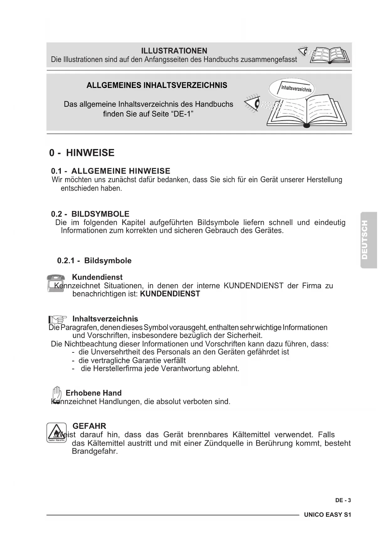 ACHTUNG Zeigt an, dass das Assistenzpersonal beim Umgang des Geräts auf die Anweisungen im Installationshandbuch zu achten hat.UNICO EASY S1 DEUTSCH DE - 5