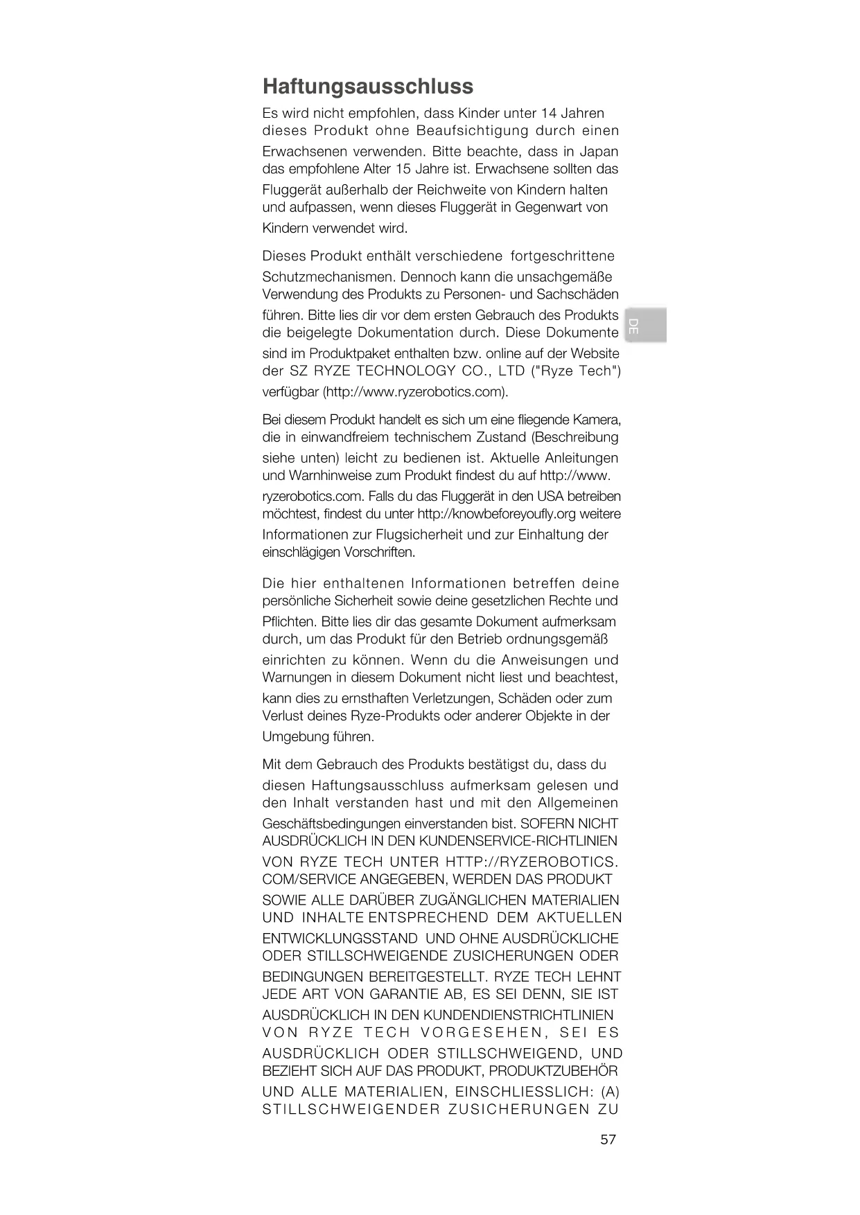 Haftungsausschluss Es wird nicht empfohlen, dass Kinder unter 14 Jahren dieses Produkt ohne Beaufsichtigung durch einen Erwachsenen verwenden. Bitte beachte, dass in Japan das empfohlene Alter 15 Jahre ist. Erwachsene sollten das Fluggerät außerhalb der Reichweite von Kindern halten und aufpassen, wenn dieses Fluggerät in Gegenwart von Kindern verwendet wird. Dieses Produkt enthält verschiedene fortgeschrittene Schutzmechanismen. Dennoch kann die unsachgemäße Verwendung des Produkts zu Personen- und Sachschäden führen. Bitte lies dir vor dem ersten Gebrauch des Produkts die beigelegte Dokumentation durch. Diese Dokumente sind im Produktpaket enthalten bzw. online auf der Website der SZ RYZE TECHNOLOGY CO., LTD ("Ryze Tech") verfügbar (http://www.ryzerobotics.com). Bei diesem Produkt handelt es sich um eine iegende Kamera, die in einwandfreiem technischem Zustand (Beschreibung siehe unten) leicht zu bedienen ist. Aktuelle Anleitungen und Warnhinweise zum Produkt ndest du auf http://www. ryzerobotics.com. Falls du das Fluggerät in den USA betreiben möchtest, ndest du unter http://knowbeforeyouy.org weitere Informationen zur Flugsicherheit und zur Einhaltung der einschlägigen Vorschriften. Die hier enthaltenen Informationen betreffen deine persönliche Sicherheit sowie deine gesetzlichen Rechte und Pichten. Bitte lies dir das gesamte Dokument aufmerksam durch, um das Produkt für den Betrieb ordnungsgemäß einrichten zu können. Wenn du die Anweisungen und Warnungen in diesem Dokument nicht liest und beachtest, kann dies zu ernsthaften Verletzungen, Schäden oder zum Verlust deines Ryze-Produkts oder anderer Objekte in der Umgebung führen. Mit dem Gebrauch des Produkts bestätigst du, dass du diesen Haftungsausschluss aufmerksam gelesen und den Inhalt verstanden hast und mit den Allgemeinen Geschäftsbedingungen einverstanden bist. SOFERN NICHT