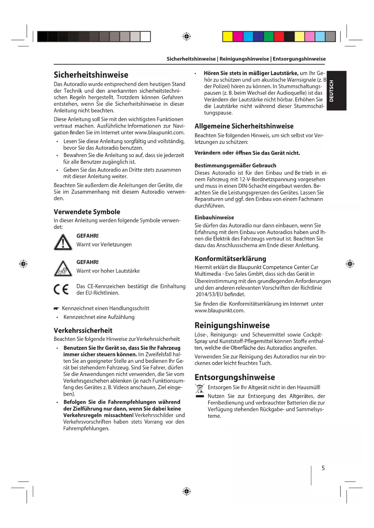 - Hören Sie stets in mäßiger Lautstärke, um Ihr Ge- hör zu schützen und um akustische Warnsignale (z. B. der Polizei) hören zu können. In Stummschaltungs- pausen (z. B. beim Wechsel der Audioquelle) ist das Verändern der Lautstärke nicht hörbar. Erhöhen Sie die Lautstärke nicht während dieser Stummschal- tungspause. Allgemeine Sicherheitshinweise Beachten Sie folgenden Hinweis, um sich selbst vor Ver- letzungen zu schützen: nen Sie das Gerät nicht. Bestimmungsgemäßer Gebrauch Dieses Autoradio ist für den Einbau und Be trieb in ei- nehesegrov gnunnaps zten droB-V-21 tim guezrhaF men und muss in einen DIN-Schacht eingebaut werden. Be- achten Sie die Leistungsgrenzen des Gerätes. Lassen Sie Reparaturen und ggf. den Einbau von einem Fachmann durchführen. Einbauhinweise Sie dürfen das Autoradio nur dann einbauen, wenn Sie Erfahrung mit dem Einbau von Autoradios haben und Ih- nen die Elektrik des Fahrzeugs vertraut ist. Beachten Sie dazu das Anschlussschema am Ende dieser Anleitung. Konformitätserklärung Hiermit erklärt die Blaupunkt Competence Center Car Multimedia - Evo Sales GmbH, dass sich das Gerät in Übereinstimmung mit den grundlegenden Anforderungen und den anderen relevanten Vorschriften der Richtlinie 2014/53/EU bendet. nden die Konformitätserklärung im Internet unter www.blaupunkt.com. Reinigungshinweise Löse-, Reinigungs- und Scheuermittel sowie Cockpit- e enthal- äche des Autoradios angreifen. Verwenden Sie zur Reinigung des Autoradios nur ein tro- ckenes oder leicht feuchtes Tuch. Entsorgungshinweise Entsorgen Sie Ihr Altgerät nicht in den Hausmüll! red ,setäregtlA sed gnugrostnE ruz eiS neztuN Fernbedienung und verbrauchter Batterien die zur Verfügung stehenden Rückgabe- und Sammelsys- teme.6 Lieferumfang Im Lieferumfang enthalten sind: