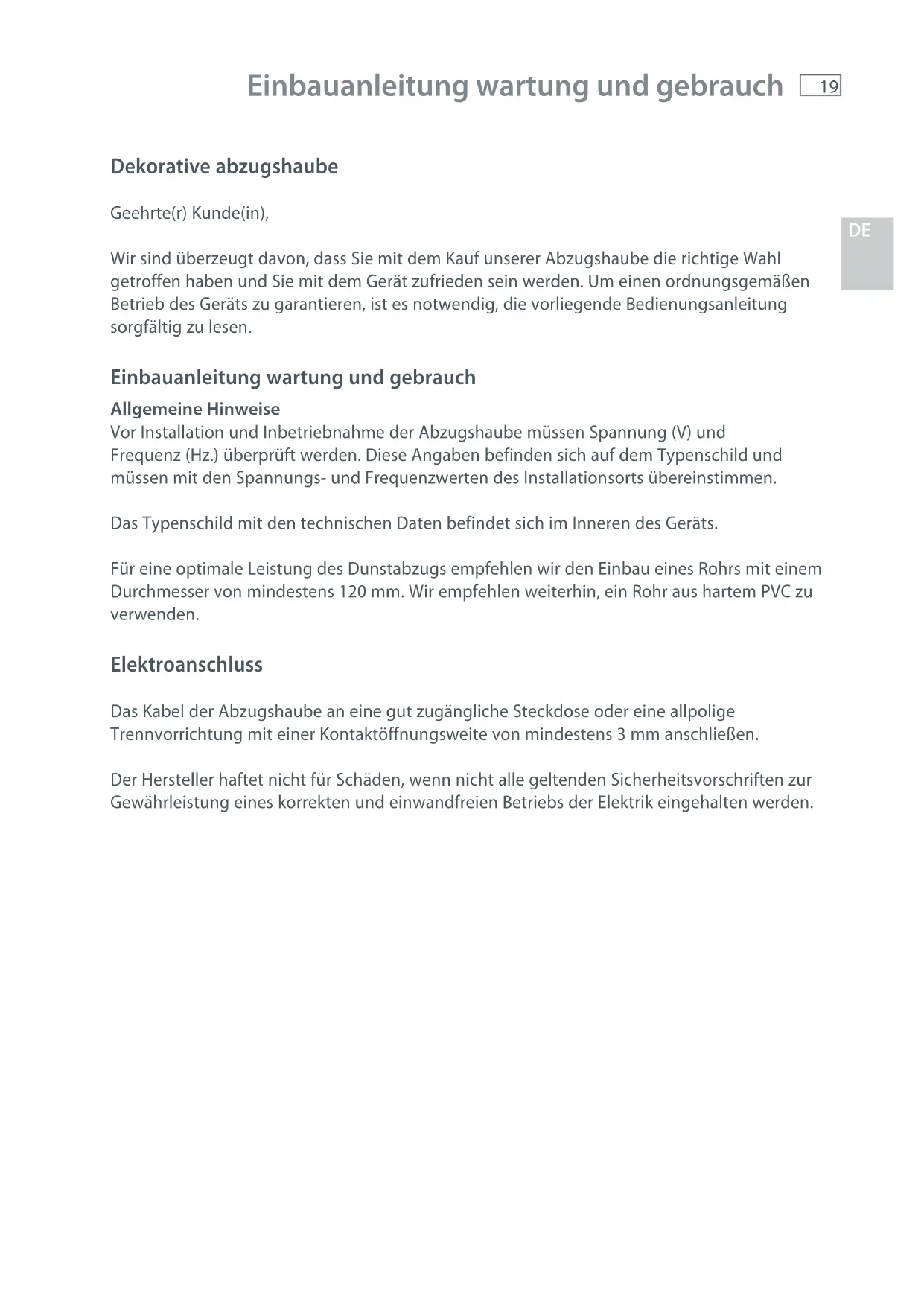 Einbauanleitung wartung und gebrauch Dekorative abzugshaube Geehrte(r) Kunde(in), Wir sind überzeugt davon, dass Sie mit dem Kauf unserer Abzugshaube die richtige Wahl getroffen haben und Sie mit dem Gerät zufrieden sein werden. Um einen ordnungsgemäßen Betrieb des Geräts zu garantieren, ist es notwendig, die vorliegende Bedienungsanleitung sorgfältig zu lesen. Einbauanleitung wartung und gebrauch Allgemeine Hinweise Vor Installation und Inbetriebnahme der Abzugshaube müssen Spannung (V) und Frequenz (Hz.) überprüft werden. Diese Angaben befinden sich auf dem Typenschild und müssen mit den Spannungs- und Frequenzwerten des Installationsorts übereinstimmen. Das Typenschild mit den technischen Daten befindet sich im Inneren des Geräts. Für eine optimale Leistung des Dunstabzugs empfehlen wir den Einbau eines Rohrs mit einem Durchmesser von mindestens 120 mm. Wir empfehlen weiterhin, ein Rohr aus hartem PVC zu verwenden. Elektroanschluss Das Kabel der Abzugshaube an eine gut zugängliche Steckdose oder eine allpolige Trennvorrichtung mit einer Kontaktöffnungsweite von mindestens 3 mm anschließen. Der Hersteller haftet nicht für Schäden, wenn nicht alle geltenden Sicherheitsvorschriften zur Gewährleistung eines korrekten und einwandfreien Betriebs der Elektrik eingehalten werden.20