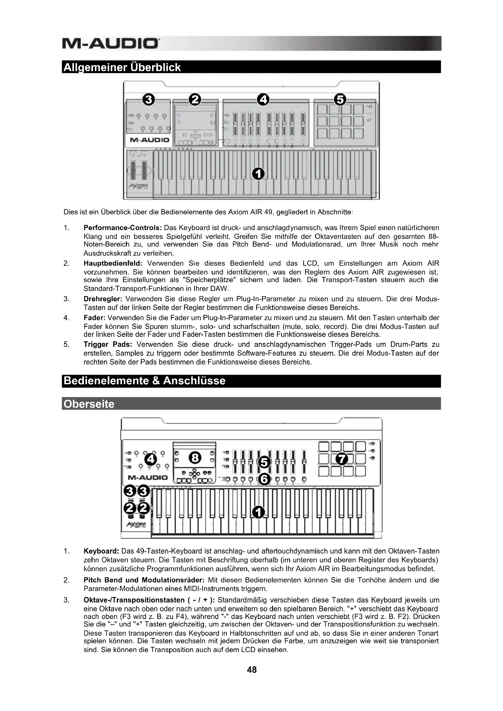 nuovamente. Controllo dell'Ignite Ignite, incluso con l'Axiom AIR, è uno strumento creativo concepito per acquisizione rapida e fluida, affinazione e condivisione di idee musicali. Si può utilizzare da solo o unitamente al proprio DAW preferito. Per scaricare Ignite, visitare la pagina airmusictech.com/download_ignite. Per informazioni più approfondite su Ignite, si veda la documentazione di Ignite. Le tastiere dell'Axiom AIR sono fornite pre-configurate per il controllo di Ignite tramite l'HyperControl. Quando si lancia Ignite con l'Axiom AIR collegato al computer, si possono utilizzare i comandi dell'Axiom AIR nei seguenti modi: Comandi di trasporto Premere il tasto modalità HyperControl Mix (tasto ) sul pannello di controllo principale, quindi utilizzare i tasti di trasporto per controllare tali funzioni di trasporto in Ignite. Navigazione Servirsi dei tasti direzionali per navigare tra le schede e i sotto-menu di Ignite, a seconda del comando corrente in evidenza. Strumenti Fare riferimento alla guida per l'uso dell'HyperControl (alla pagina m-audio.com/hypercontrol) per vedere quale parametro è assegnato a ciascun comando.46 BENUTZERHANDBUCH (DEUTSCH) Lieferumfang Axiom AIR 49 USB-Kabel Pro Tools Express DVD Benutzerhandbuch iLok 2 Sicherheitshinweise und Garantieinformationen Kundendienst Für die vollständigen Systemanforderungen, Kompatibilitätsinformationen und für die Produktregistrierung besuchen Sie bitte den Support-Bereich auf der M-Audio-Website: m-audio.com/support. Wichtig! Erforderliche Downloads Windows-Benutzer: Besuchen Sie m-audio.com/axiomair49, um die zusätzlichen Treiber für Ihr Axiom AIR herunterzuladen, so dass HyperControl ordnungsgemäß funktioniert (siehe unten). Mit diesen Treibern können Sie Ihr Axiom AIR mit mehr als einer Anwendung gleichzeitig und/oder in Verbindung mit anderen klassenkompatiblen USB-Geräten mit Audio-Funktionen verwenden. Mac-Benutzer: Es müssen keine Mac-spezifischen Treiber installiert werden. HyperControl Installation Anstatt jeden Parameter einzeln zuzuweisen, aktiviert der HyperControl-Modus Ihres Axiom AIR die automatische Zuordnung der Regler für viele häufig verwendete Software-Features und Einstellungen der digitalen Audio-Workstation (DAW). Wenn Sie eine unterstützte DAW-Anwendung verwenden, können Sie Transport, Mixing-Controls (Fader und Pan), virtuelle Instrumente oder Plug-In-Parameter für die Signalverarbeitung steuern. Sie können auch spontan zwischen HyperControl und benutzerdefiniertem MIDI-Betrieb wechseln, um Ihren speziellen Bedürfnissen nachzukommen. Um HyperControl mit Ihrem Axiom AIR zu verwenden, müssen Sie zusätzliche Software installieren, inklusive der HyperControl-"Funktionalität" für Ihre spezifische DAW. Besuchen Sie m-audio.com/hypercontrol für eine aktuelle Liste der DAWs, die HyperControl unterstützen. Lesen Sie außerdem den Abschnitt HyperControl dieses Handbuchs für weitere Informationen. Zusätzliche Installationen Wir empfehlen auch die folgenden Softwareanwendungen zu installieren: Pro Tools-Express: Wir haben Ihrem Axiom AIR Pro Tools Express beigefügt, so dass Sie sofort mit einer professionellen DAW mit der Musikproduktion beginnen können.