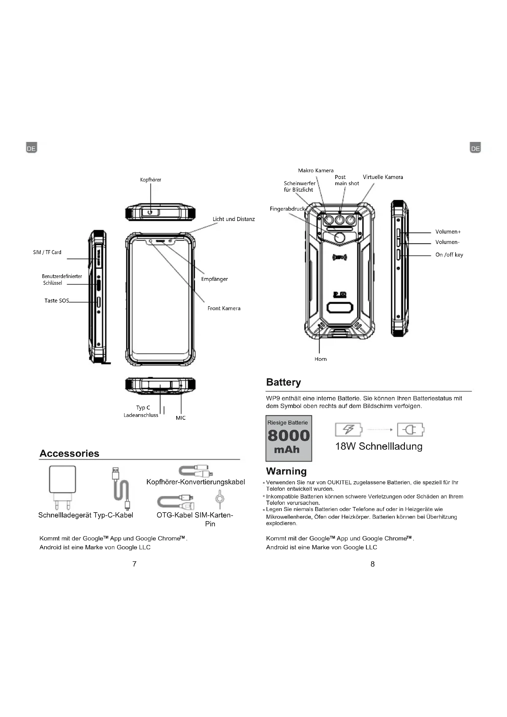 Android is a trademark of Google LLC 5 6Battery Warning 18W Schnellladung Accessories WP9 enthält eine interne Batterie. Sie können Ihren Batteriestatus mit dem Symbol oben rechts auf dem Bildschirm verfolgen. Verwenden Sie nur von OUKITEL zugelassene Batterien, die speziell für Ihr Telefon entwickelt wurden.Inkompatible Batterien können schwere Verletzungen oder Schäden an Ihrem Telefon verursachen.Legen Sie niemals Batterien oder Telefone auf oder in Heizgeräte wie Mikrowellenherde, Öfen oder Heizkörper. Batterien können bei Überhitzung explodieren.