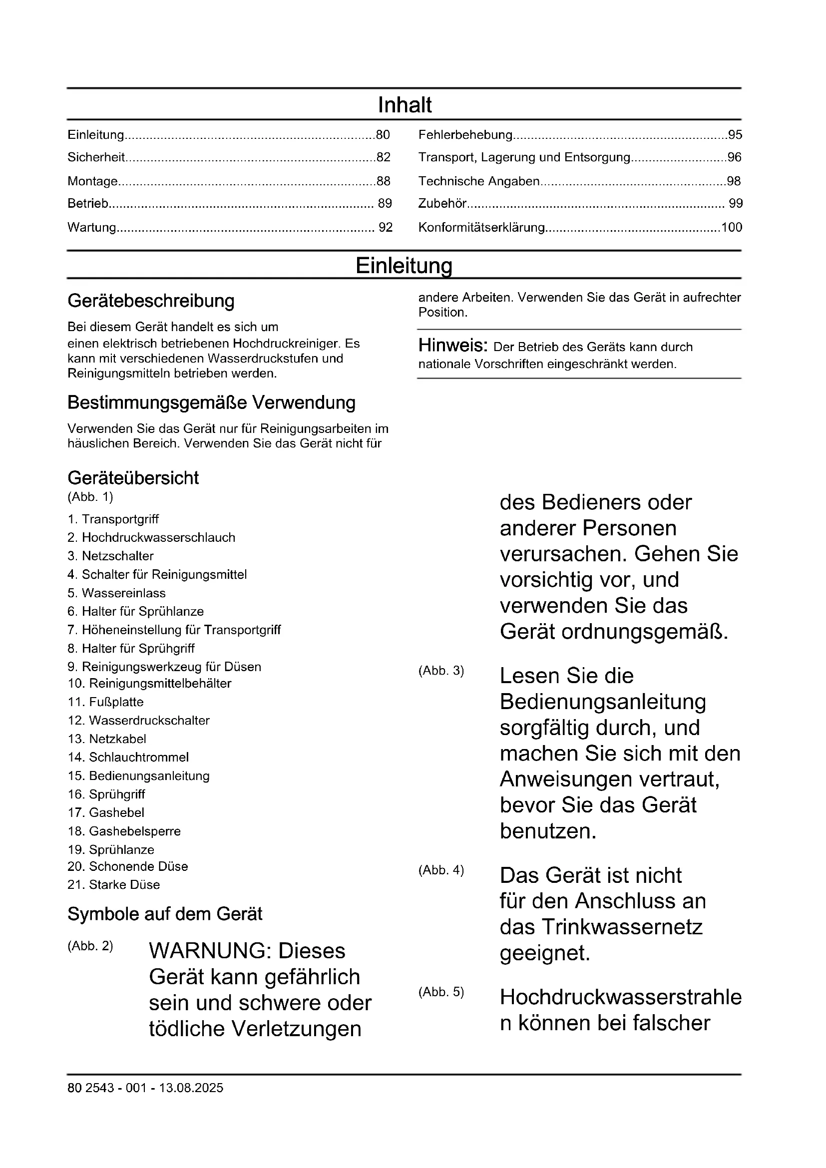 Symbole auf dem Gerät (Abb. 2) WARNUNG: Dieses Gerät kann gefährlich sein und schwere oder tödliche Verletzungen des Bedieners oder anderer Personen verursachen. Gehen Sie vorsichtig vor, und verwenden Sie das Gerät ordnungsgemäß. (Abb. 3) Lesen Sie die Bedienungsanleitung sorgfältig durch, und machen Sie sich mit den Anweisungen vertraut, bevor Sie das Gerät benutzen. (Abb. 4) Das Gerät ist nicht für den Anschluss an das Trinkwassernetz geeignet. (Abb. 5) Hochdruckwasserstrahle n können bei falscher 80 2543 - 001 - 13.08.2025Anwendung gefährlich sein. Der Strahl darf nicht auf Personen, elektrische Geräte oder das Gerät selbst gerichtet werden. (Abb. 6) Umweltkennzeichen. Das Gerät und die Verpackung des Geräts dürfen nicht über den Hausmüll entsorgt werden. Recyceln Sie es an einer offiziellen Recyclingstation für elektrische und elektronische Geräte. (Abb. 7) Gerät der Klasse II. (Abb. 8) Etikett mit Geräuschemissionen gemäß EU- und UK-Richtlinien und Verordnungen sowie der australischen „Protection of the Environment Operations (Noise Control) Regulation2017“ (Umweltschutz-/ Lärmschutzbestimmung) von New South Wales. Der garantierte Schallleistungspegel des Geräts ist unter Technische Angaben auf Seite 98 und auf dem Etikett angegeben. (Abb. 9) Geschützt gegen Niederdruckwasserstrah len aus jedem Winkel. (Abb. 10) Vor Frost schützen. (Abb. 11) Dieses Gerät stimmt mit den geltenden EG- Richtlinien überein. Hinweis: Sonstige Symbole/Aufkleber auf dem Gerät beziehen sich auf Zertifizierungsanforderungen, die in einigen Märkten gelten. Produktschäden Wir haften nicht für Schäden an unserem Produkt, wenn: