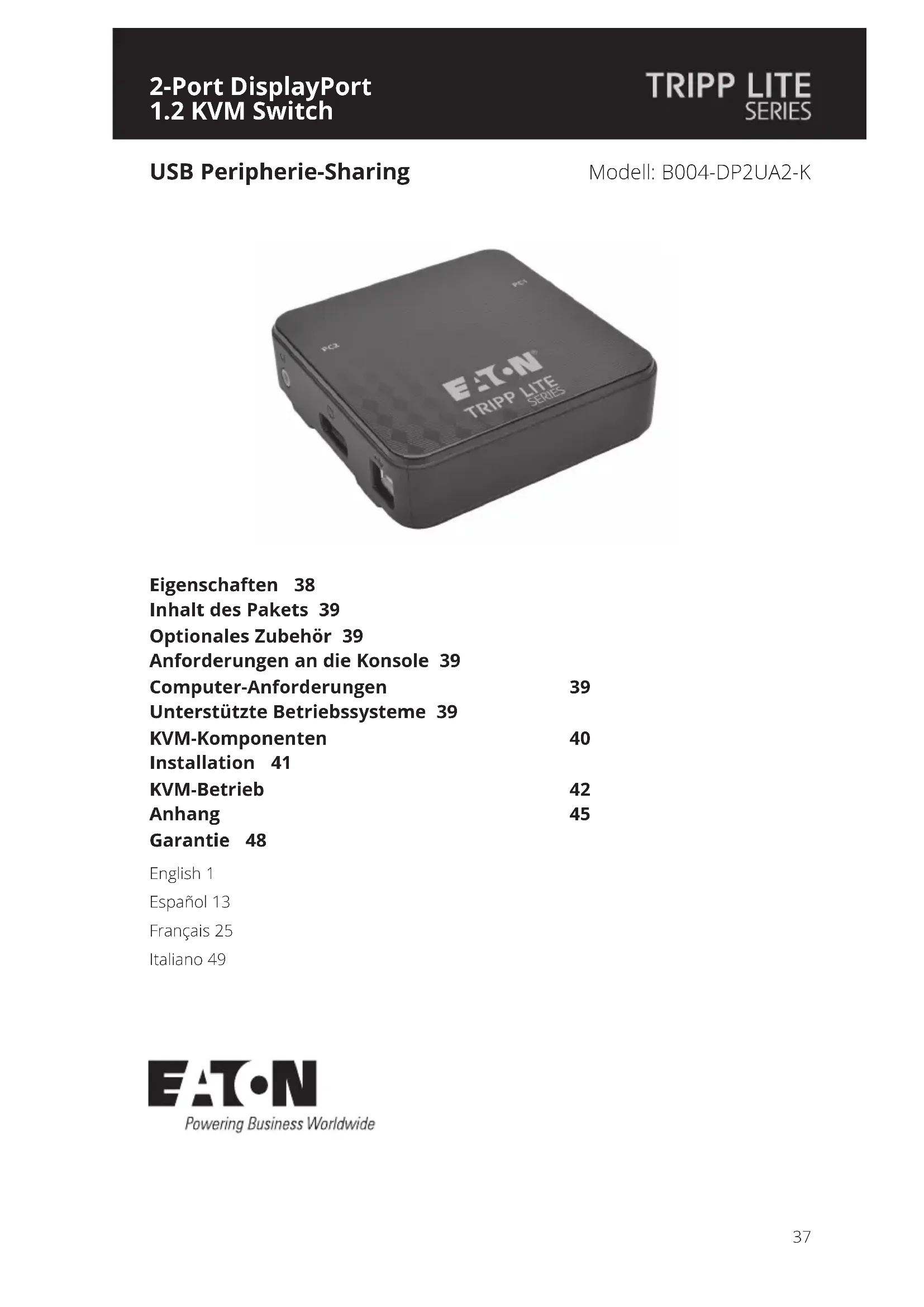 Modell: B004-DP2UA2-K USB Peripherie-Sharing English 1 Español 13 Français 25 Italiano 49• Steuern Sie zwei DisplayPort™ Computer über eine einzige DisplayPort-Videokonsole