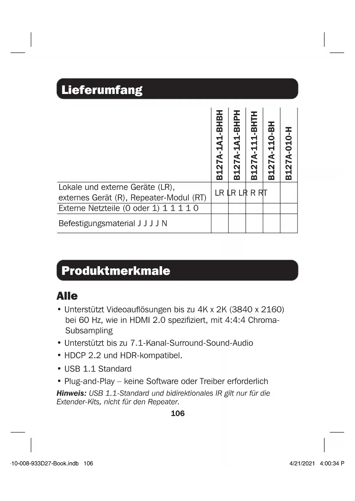 - Plug-and-Play – keine Software oder Treiber erforderlich Hinweis: USB 1.1-Standard und bidirektionales IR gilt nur für die Extender-Kits, nicht für den Repeater. 20-10-008-933D27-Book.indb 10620-10-008-933D27-Book.indb 106 4/21/2021 4:00:34 PM4/21/2021 4:00:34 PM107 Produktmerkmale