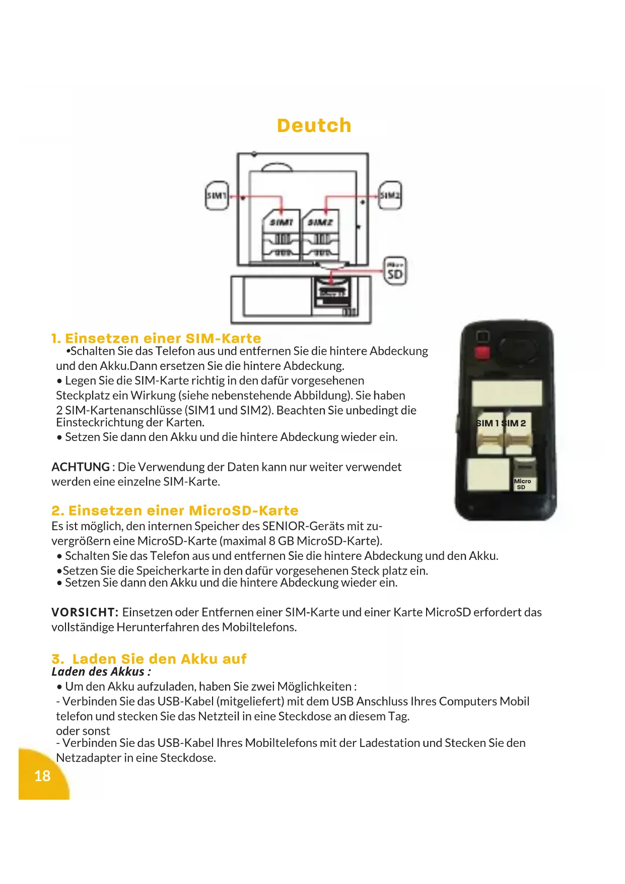 - Um den Akku aufzuladen, haben Sie zwei Möglichkeiten : - Verbinden Sie das USB-Kabel (mitgeliefert) mit dem USB Anschluss Ihres Computers Mobil telefon und stecken Sie das Netzteil in eine Steckdose an diesem Tag. oder sonst - Verbinden Sie das USB-Kabel Ihres Mobiltelefons mit der Ladestation und Stecken Sie den Netzadapter in eine Steckdose. SIM 1 SIM 2 Micro SD19