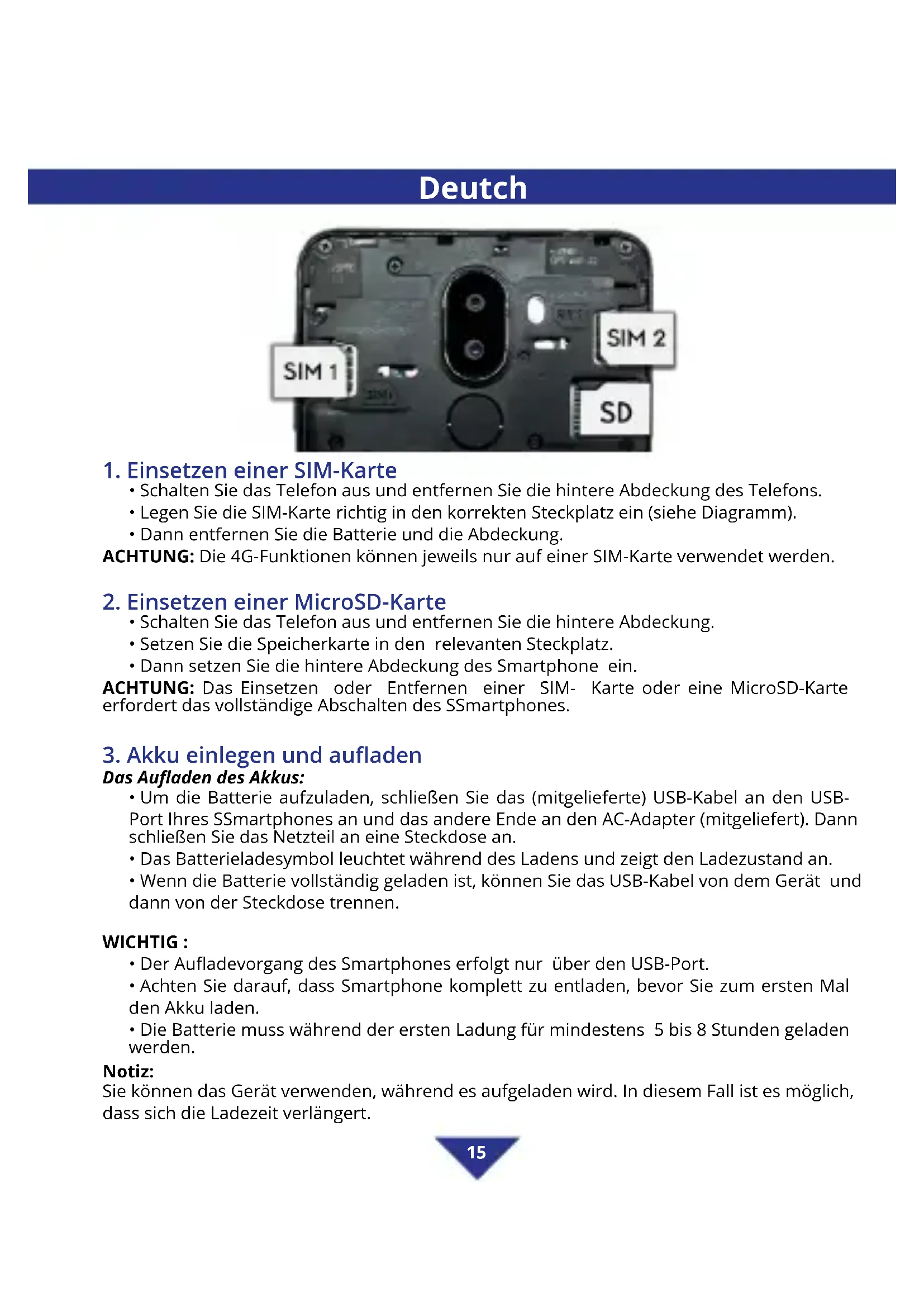 - Dann setzen Sie die hintere Abdeckung des Smartphone ein. ACHTUNG: Das Einsetzen oder Entfernen einer SIM- Karte oder eine MicroSD-Karte erfordert das vollständige Abschalten des SSmartphones.