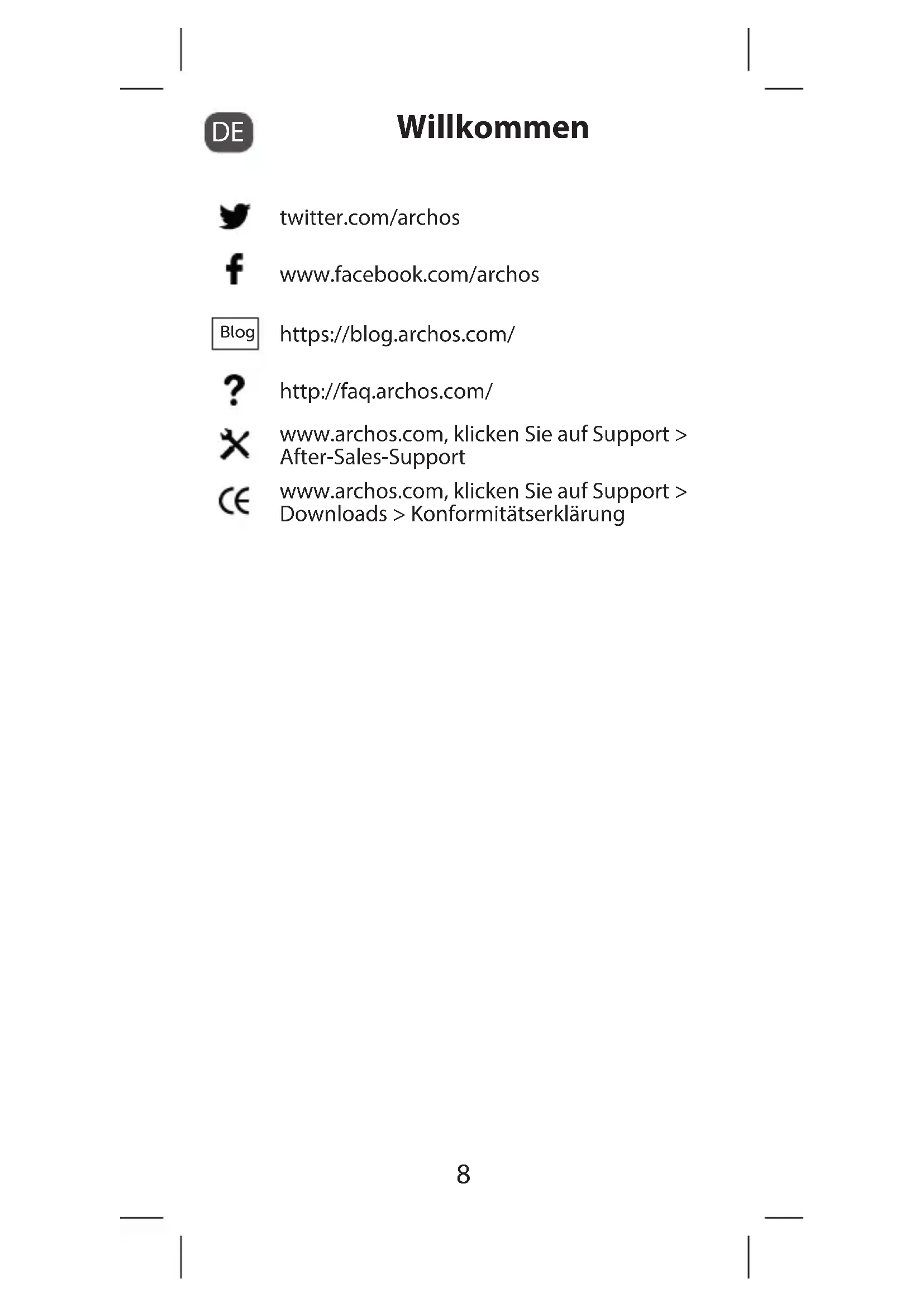 Willkommen twitter.com/archos www.facebook.com/archos Blog https://blog.archos.com/ http://faq.archos.com/ www.archos.com, klicken Sie auf Support > After-Sales-Support www.archos.com, klicken Sie auf Support > Downloads > Konformitätserklärung9