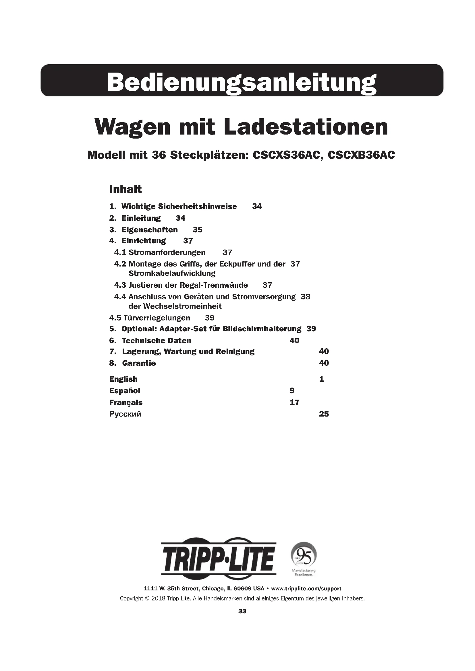 English 1 Español 9 Français 17 Русский 25 Wagen mit Ladestationen Modell mit 36 Steckplätzen: CSCXS36AC, CSCXB36AC Bedienungsanleitung 1111 W. 35th Street, Chicago, IL 60609 USA • www.tripplite.com/supportCopyright © 2018 Tripp Lite. Alle Handelsmarken sind alleiniges Eigentum des jeweiligen Inhabers.34