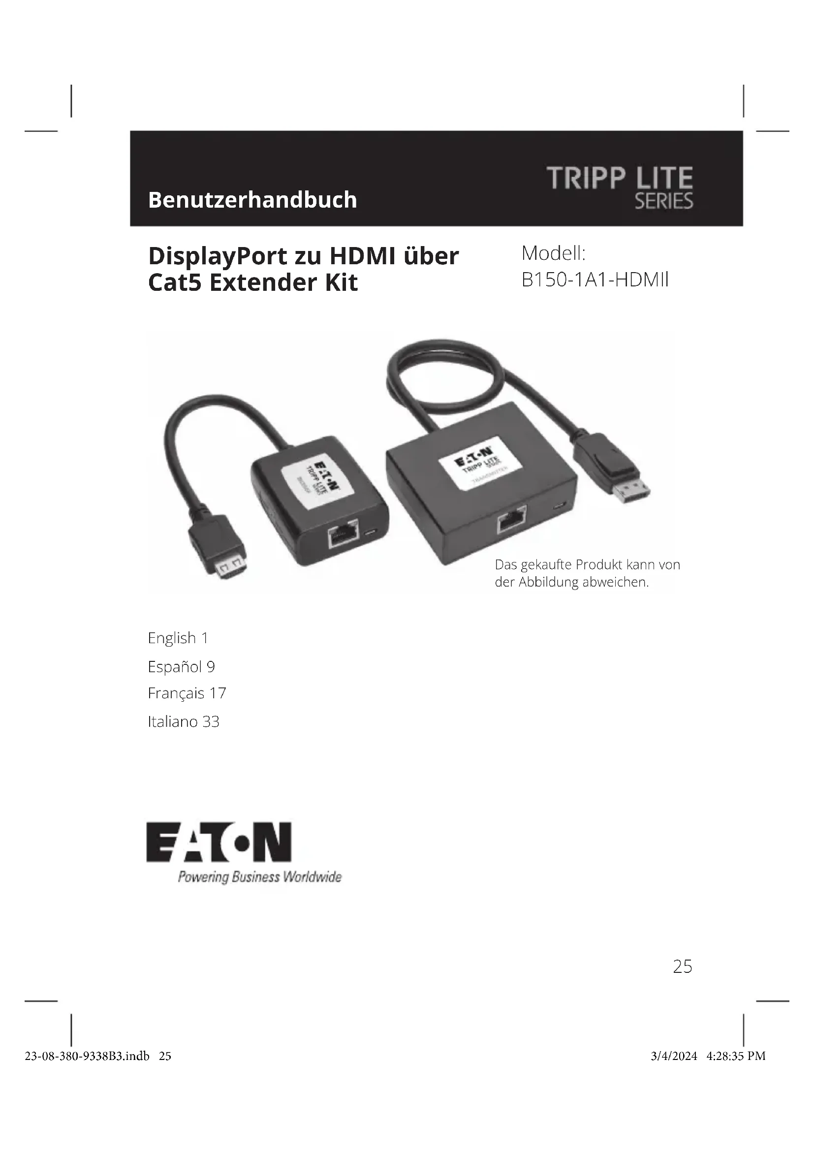 - Rücksendung der neuen Geräte zum Recyling, wenn ihr Lebenszyklus abgelaufen ist Die Verwendung dieses Geräts für lebenserhaltende Systeme, bei denen der Ausfall des Geräts den Ausfall des Lebenserhaltungssystems verursachen oder dessen Sicherheit beziehungsweise Wirksamkeit bedeutend beeinträchtigen kann, wird nicht empfohlen. Eaton verfolgt eine Politik der kontinuierlichen Verbesserung. Spezikationen können ohne Ankündigung geändert werden. 23-08-380-9338B3.indb 3123-08-380-9338B3.indb 31 3/4/2024 4:28:36 PM3/4/2024 4:28:36 PM32 Eaton 1000 Eaton Boulevard Cleveland, OH 44122 United States Eaton.com © 2024 Eaton Alle Rechte vorbehalten. Veröffentlichung Nr. 23-08-380 / 93-38B3_RevB März 2024 Eaton ist eine eingetragene Handelsmarke. Alle Marken sind Eigentum der jeweiligen Inhaber. 23-08-380-9338B3.indb 3223-08-380-9338B3.indb 32 3/4/2024 4:28:36 PM3/4/2024 4:28:36 PM33 Manuale d'uso Il prodotto acquistato potrebbe differire dall’immagine. Modello: