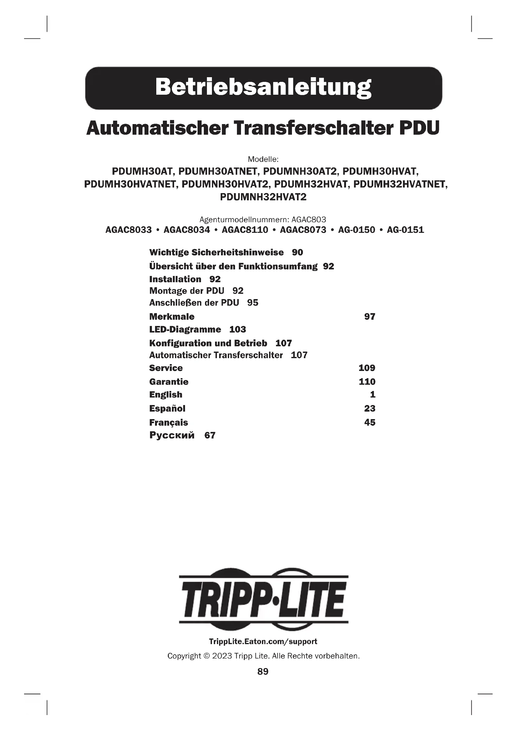 LED-Diagramme 103 Konfiguration und Betrieb 107 Automatischer Transferschalter 107 Service 109 Garantie 110 English 1 Español 23 Français 45 Русский 67 TrippLite.Eaton.com/support Copyright © 2023 Tripp Lite. Alle Rechte vorbehalten.90 Wichtige Sicherheitshinweise Dieses Handbuch enthält Informationen zur ordnungsgemäßen Installation und Verwendung der Rackmount-Steckdosenleisten von Tripp Lite. BITTE BEWAHREN SIE DIESE ANLEITUNG AUF. Schließen Sie Ihre Steckdosenleiste nicht an eine ungeerdete Steckdose an. Verwenden Sie sie nicht mit Verlängerungskabeln oder Adaptern, die die Verbindung zur Erdung aufheben. Ihre Steckdosenleiste ist ausschließlich für den Gebrauch in Innenräumen bestimmt. Installieren Sie sie entfernt von wärmeabgebenden Geräten wie Heizkörpern und Heizregistern. Bringen Sie sie nicht an Stellen an, an denen übermäßige Feuchtigkeit oder andere leitfähige Verunreinigungen vorhanden sind. Installieren Sie Elektrokabel niemals während eines Gewitters. Der Strombedarf jedes Geräts, das an eine Steckdose Ihrer Steckdosenleiste angeschlossen ist, darf die Ausgangsnennleistung Ihrer Steckdosenleiste nicht überschreiten (siehe Spezifikationen). Der Gesamtstrombedarf aller an Ihre Steckdosenleiste angeschlossenen Geräte darf die maximale Belastbarkeit Ihrer Steckdosenleiste nicht überschreiten (siehe Spezifikationen). VORSICHT Nur Personen, die für die Verwendung dieses Geräts entsprechend geschult oder qualifiziert sind, sollten dies tun. Personen, die nicht geschult oder qualifiziert sind, sollten dieses Gerät nicht verwenden, es sei denn, es steht unter der Aufsicht einer Person, die dafür ordnungsgemäß geschult oder qualifiziert ist. Kinder sind zu beaufsichtigen, um sicherzustellen, dass sie das Gerät nicht als Spielzeug verwenden. Benutzen Sie das Gerät niemals, wenn Kabel und Stecker beschädigt sind; Wenn es nicht richtig funktioniert, heruntergefallen oder beschädigt ist, bringen Sie es zur Inspektion und Reparatur zu einem autorisierten Servicecenter. Wenn das Netzkabel beschädigt ist, muss es vom Hersteller, seinem autorisierten Servicepartner oder von qualifiziertem Personal ersetzt werden, um Gefahren zu vermeiden.