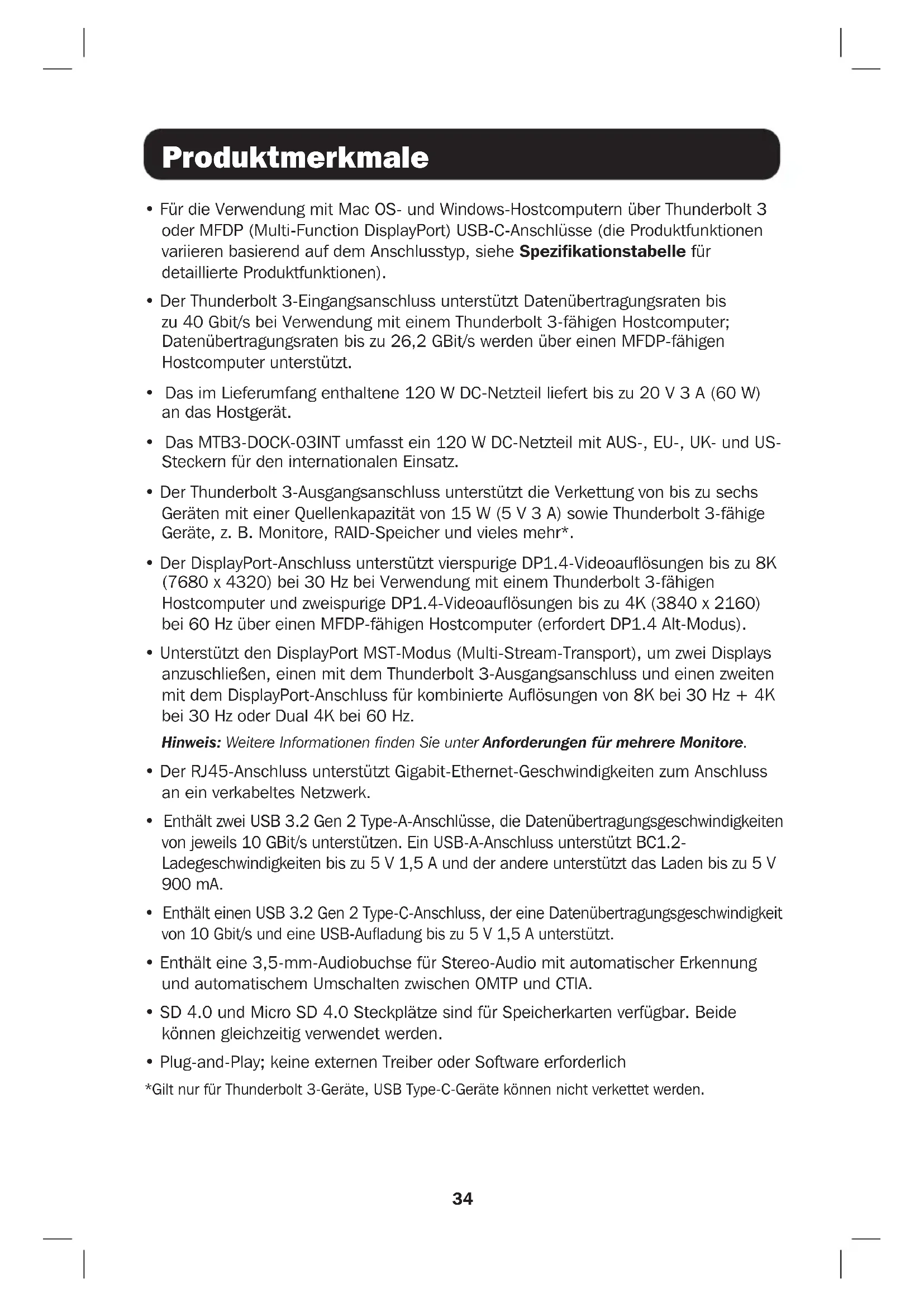 des Docks. Die beiden Steckplätze können gleichzeitig verwendet werden.38 Multi-Monitor-Anforderungen Das MTB3-DOCK-03 und MTB3-DOCK-03INT unterstützen den Anschluss von zwei Monitoren gleichzeitig über den DisplayPort MST-Modus (Multi-Stream Transport). Schließen Sie gleichzeitig einen DisplayPort-Monitor und einen Thunderbolt 3-fähigen Monitor an. Beim gleichzeitigen Anschließen mehrerer Monitore sind folgende Einschränkungen zu berücksichtigen: Unterstützt der Quellcomputer den DisplayPort MST-Modus? Beim Anschluss an eine Thunderbolt 3-Quelle, die den DisplayPort MST-Modus unterstützt, werden die EDID-Informationen beider angeschlossener Monitore vom Computer gelesen und erscheinen als separate Anzeigen, die im Spiegelmodus oder im erweiterten Modus angezeigt werden können. Sowohl die DisplayPort- als auch die Thunderbolt3-Anschlüsse können bei Verwendung mit einem Thunderbolt 3-fähigen Quellcomputer und Thunderbolt 3-Kabel Videoauflösungen bis zu 8K (7680 x 4320) bei 30 Hz erreichen. Die Anschlüsse können gleichzeitig bei Auflösungen von 8K bei 30 Hz plus 4K bei 30 Hz verwendet werden. Beim Anschluss an eine Thunderbolt 3-Quelle, die den DisplayPort MST-Modus nicht unterstützt, zeigt nur ein Videoanschluss das Video in der Reihenfolge des Eingangs an und ist immer der erste Videoanschluss, der verbunden wird. Unterstützt der Quellcomputer eine Thunderbolt 3-Verbindung? Das MTB3-DOCK-03 und MTB3-DOCK-03INT können verwendet werden, um Video von Quellcomputern zu übertragen, die über einen Thunderbolt 3-Anschluss oder einen USB Type-C-Anschluss verfügen, der MFDP (Multi-Function DisplayPort) unterstützt. Um eine optimale Leistung und Videoauflösung zu erzielen, sollte das Gerät mit einem Thunderbolt 3-fähigen Anschluss verwendet werden. Bei Anschluss an den Thunderbolt 3-Anschluss eines Computers unterstützt der DisplayPort- Anschluss vierspurige DP1.4-Videoauflösungen bis zu 8K (7680 x 4320) bei 30 Hz. Bei Anschluss an einen USB Type-C MFDP-fähigen Anschluss kann der DisplayPort- Anschluss nur zweispurige DP1.4-Videoauflösungen bis zu 4K (3840 x 2160) bei 60 Hz erreichen und erfordert, dass der Hostcomputer den DP1.4 Alternativmodus unterstützt. Der Thunderbolt 3-Ausgangsanschluss kann nicht verwendet werden, um Video zu übertragen, wenn er an einen USB Type-C-Anschluss angeschlossen ist, da er auf diese Weise nur die USB 2.0-Datenübertragung unterstützt.39 Technische Daten Bei Anschluss an den Thunderbolt 3-fähigen Anschluss Bei Anschluss an den USB Type-C MFDP-Anschluss Anschlüsse - Eingang DC-Anschluss DC-Leistung (Buchse) Thunderbolt 3 Thunderbolt 3 Type-C (Buchse) Anschlüsse - Ausgang USB-A USB 3.2 Gen 2 Type-A (Buchse) x2 USB-C USB 3.2 Gen 2 Type-C (Buchse) Ethernet RJ45 (Buchse) DisplayPort DisplayPort (Buchse) Audioanschluss 3,5 mm (Buchse) Speicher SD 4.0 (Buchse); Micro-SD 4.0 (Buchse) Spezifikationen für die Datenübertragung Thunderbolt 3 (Eingang) Thunderbolt 3 (40 Gbit/s) USB 3.2 Gen 2 (26,2 GBit/s) Thunderbolt 3 (Ausgang) Thunderbolt 3 (40 Gbit/s), Daten + Video USB 2.0 (480 Mbit/s), Daten + Aufladung USB-A (x2) USB 3.2 Gen 2 (10 Gbit/s), Daten + Aufladung USB-C USB 3.2 Gen 2 (10 Gbit/s), Daten + Aufladung Speicher (SD + Micro-SD) SD 4.0, mSD 4.0 (312 Mbit/s) Audioanschluss Bis zu 384 Khz, 16/24/32 Bit Abtastrate Umgebungsinformationen Betriebstemperatur 0 bis 45 °C Luftfeuchtigkeit bei Betrieb 10 % bis 90 % rF, nicht kondensierend Lagertemperatur 0 bis 70 °C Feuchtebereich für die Lagerung 10 % bis 90 % rF, nicht kondensierend Netzwerkspezifikationen RJ45 10/100/1000 Mbit/s (1 Gigabit) Anzeigespezifikationen DisplayPort 7680 x 4320 bei 30 Hz (8K UHD) 3840 x 2160 bei 60 Hz (4K UHD) Thunderbolt 3 7680 x 4320 bei 30 Hz Video wird nicht unterstützt Dual-Display (MST-Modus) 8K bei 30 Hz + 4K bei 30 Hz oder 4K bei 60 HZ + 4K bei 60 HZ Video wird nicht unterstützt Elektrische Spezifikationen Stromversorgung DC 120 W (20 V 6 A) Thunderbolt 3 (Eingang) Lädt Host-PC bis zu 60 W (5 V-20 V 3 A) auf Thunderbolt 3 (Ausgang) Verkettung von bis zu 6 Geräten mit einer Quellenkapazität von 15 W (5 V 3 A) USB-A (BC1.2) Max. 5 V 1,5 A nachgeschaltete Aufladung USB-A Maximale 5 V 900 mA nachgeschaltete Aufladung USB-C Max. 5 V 1,5 A nachgeschaltete Aufladung40 Garantie 3 Jahre eingeschränkte Garantie Tripp Lite garantiert, dass seine Produkte für einen Zeitraum von drei (3) Jahren ab dem Datum des Erstkaufs frei von Material- und Verarbeitungsfehlern sind. Die Verpflichtung von Tripp Lite im Rahmen dieser Garantie beschränkt sich auf die Reparatur oder den Ersatz (nach eigenem Ermessen) der fehlerhaften Produkte. Um Service im Rahmen dieser Garantie zu erhalten, müssen Sie eine RMA-Nummer (Returned Material Authorization) von Tripp Lite oder einem autorisierten Tripp-Lite-Servicezentrum erhalten. Die Produkte müssen an Tripp Lite oder an ein autorisiertes Tripp-Lite-Servicezentrum unter Vorauszahlung der Transportkosten zurückgeschickt werden und mit einer kurzen Beschreibung des aufgetretenen Problems sowie einem Nachweis über Datum und Ort des Kaufs versehen sein. Diese Garantie gilt nicht für Geräte, die durch Unfall, Fahrlässigkeit oder falsche Anwendung beschädigt wurden oder in irgendeiner Weise geändert oder modifiziert wurden. MIT AUSNAHME DER HIERIN ENTHALTENEN BESTIMMUNGEN GIBT Tripp Lite KEINE GARANTIEN, WEDER AUSDRÜCKLICH NOCH STILLSCHWEIGEND, EINSCHLIESSLICH GARANTIEN DER MARKTGÄNGIGKEIT UND EIGNUNG FÜR EINEN BESTIMMTEN ZWECK. Einige Staaten gestatten keine Beschränkung oder keinen Ausschluss stillschweigender Gewährleistungen; daher kann es sein, dass die oben genannten Beschränkungen oder Ausschlüsse auf den Käufer nicht zutreffen. MIT AUSNAHME DER OBIGEN BESTIMMUNGEN IST Tripp Lite UNTER KEINEN UMSTÄNDEN HAFTBAR FÜR DIREKTE, INDIREKTE, SPEZIELLE, ZUFÄLLIGE ODER FOLGESCHÄDEN, DIE SICH AUS DER VERWENDUNG DIESES PRODUKTES ERGEBEN, SELBST WENN AUF DIE MÖGLICHKEIT SOLCHER SCHÄDEN HINGEWIESEN WURDE. Insbes