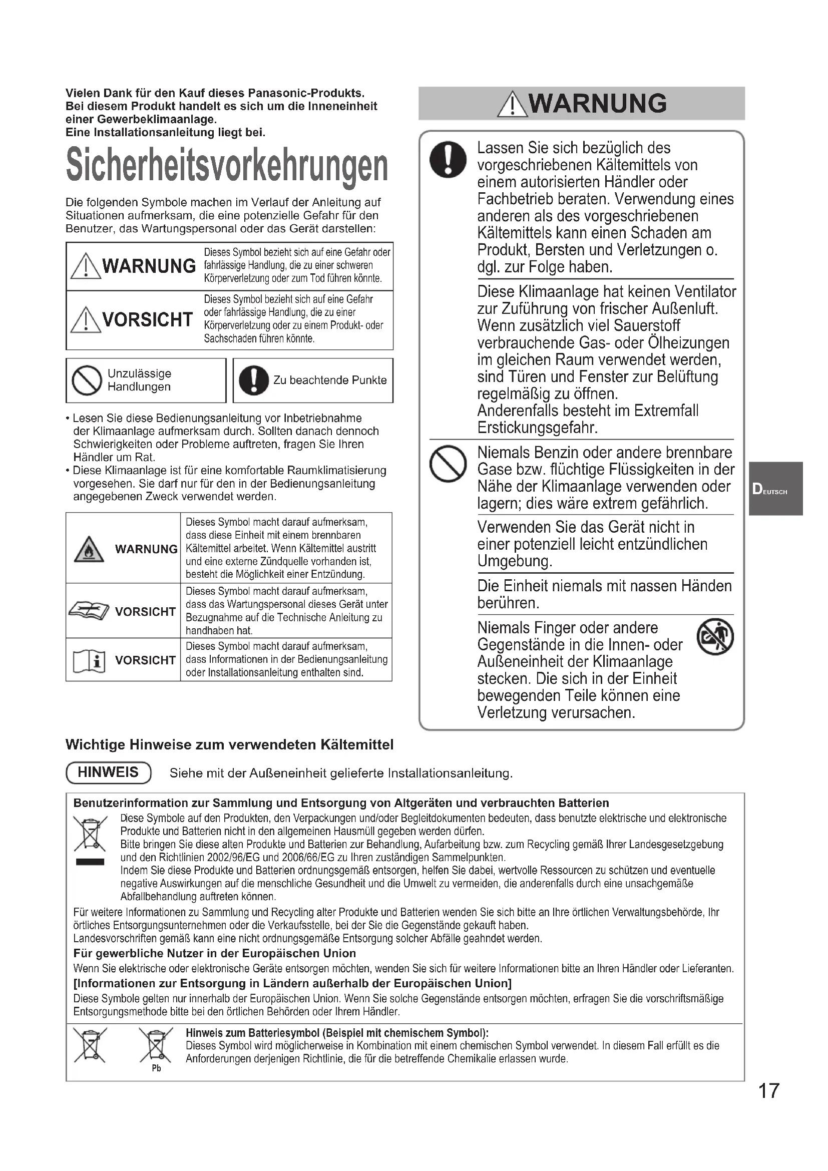 iese Symbole auf den Produkten, den Verpackungen und/oder Begleitdokumenten bedeuten, dass benutzte elektrische und elektronische Produkte und Batterien nicht in den allgemeinen Hausmüll gegeben werden dürfen. Bitte bringen Sie diese alten Produkte und Batterien zur Behandlung, Aufarbeitung bzw. zum Recycling gemäß Ihrer Landesgesetzgebung und den Richtlinien 2002/96/EG und 2006/66/EG zu Ihren zuständigen Sammelpunkten. Indem Sie diese Produkte und Batterien ordnungsgemäß entsorgen, helfen Sie dabei, wertvolle Ressourcen zu schützen und eventuelle negative Auswirkungen auf die menschliche Gesundheit und die Umwelt zu vermeiden, die anderenfalls durch eine unsachgemäße Abfallbehandlung auftreten können. Für weitere Informationen zu Sammlung und Recycling alter Produkte und Batterien wenden Sie sich bitte an Ihre örtlichen Verwaltungsbehörde, Ihr örtliches Entsorgungsunternehmen oder die Verkaufsstelle, bei der Sie die Gegenstände gekauft haben.Landesvorschriften gemäß kann eine nicht ordnungsgemäße Entsorgung solcher Abfälle geahndet werden.Für gewerbliche Nutzer in der Europäischen Union Wenn Sie elektrische oder elektronische Geräte entsorgen möchten, wenden Sie sich für weitere Informationen bitte an Ihren Händler oder Lieferanten. [Informationen zur Entsorgung in Ländern außerhalb der Europäischen Union] Diese Symbole gelten nur innerhalb der Europäischen Union. Wenn Sie solche Gegenstände entsorgen möchten, erfragen Sie die vorschriftsmäßige Entsorgungsmethode bitte bei den örtlichen Behörden oder Ihrem Händler. Hinweis zum Batteriesymbol (Beispiel mit chemischem Symbol):Dieses Symbol wird möglicherweise in Kombination mit einem chemischen Symbol verwendet. In diesem Fall erfüllt es die Anforderungen derjenigen Richtlinie, die für die betreffende Chemikalie erlassen wurde. OI_00_321320_all.indb 17 2020/11/24 13:39:3418 Wenn das Kältemittel mit einer Flamme in Berührung kommt, wird ein toxisches Gas erzeugt. Vor Reinigungs- oder Wartungsarbeiten zur Sicherheit die Klimaanlage ausschalten und auch von der Stromversorgung trennen. In einem Notfall den Netzstecker aus der Steckdose ziehen oder den Trennschalter ausschalten oder das entsprechende Trennorgan abschalten, um die Klimaanlage von der Stromversorgung zu trennen. Die Entsorgung muss in Übereinstimmung mit der nationalen und/ oder örtlichen Gesetzgebung erfolgen. Dieses Produkt darf unter keinen Umständen abgeändert oder zerlegt werden. Ein Abändern oder Zerlegen der Einheit kann einen Brand, einen Stromschlag oder eine Verletzung verursachen. Im Inneren von Innen- und Außeneinheiten benden sich keine vom Benutzer zu reinigenden Teile. Einen autorisierten Händler oder Spezialisten mit der Reinigung beauftragen. Im Falle einer Betriebsstörung dieses Geräts nicht versuchen, diese eigenhändig zu beseitigen. Den Vertriebshändler oder Servicehändler mit Instandsetzungsarbeiten und der Entsorgung beauftragen. Für den Anschluss jeder Einheit muss eine separate Steckdose vorhanden sein; innerhalb des ausschließlich für die Einheit verwendeten Stromversorgungskabels muss ein Trennschalter, ein Fehlerstromschutzschalter (ELCB) oder eine Fehlerstrom-Schutzeinrichtung (RCD) zum Schutz gegen Überstrom vorhanden sein. Für jede Einheit ist eine separate Steckdose vorzusehen, und den Verkabelungsbestimmungen gemäß muss in der Festverkabelung eine Möglichkeit zur vollständigen Abschaltung durch Kontakttrennung aller Pole bestehen. WARNUNG Um Stromschlaggefahr durch Isolierungsausfall zu vermeiden, muss die Einheit geerdet werden. Verwenden Sie keine abgeänderten Kabel, keine Mehrfachstecker, Verlängerungskabel oder Kabel ohne Spezikation, um ein Überhitzen und einen Brand zu vermeiden. Das Gerät ist in einem Raum ohne andauernd arbeitende Zündquellen (z. B. offene Flammen, in Betrieb bendliches Gasgerät oder in Betrieb bendliche Elektroheizung) zu lagern. Beachten Sie, dass Kältemittel geruchlos sein können. Ein nicht belüfteter Ort, an dem ein Gerät installiert wird, das mit einem brennbaren Kältemittel arbeitet, muss so ausgeführt werden, dass eventuell ausleckendes Kältemittel sich nicht stauen kann und zu einem Brand- oder Explosionsrisiko wird. Das Gerät ist in einem gut belüfteten Bereich zu lagern, dessen Raumgröße der für den Betrieb spezizierten Raumgröße entspricht. Bringen Sie nach der Installation der Einheit unbedingt in Erfahrung, wie groß die Bodenäche des Raums ist, in dem die Einheit installiert wurde, und mit wie viel Kältemittel sie befüllt wurde. Lassen Sie sich bei einem Wechsel der Einheit oder der Raumaufteilung unbedingt vom Vertriebshändler oder Servicehändler beraten. Zur Beschleunigung des Entfrostungsprozesses und zur Reinigung keine anderen als die vom Hersteller empfohlenen Mittel verwenden. Nicht durchstechen oder verbrennen. In Fällen, die eine mechanische Lüftung erfordern, sind Lüftungsöffnungen von Hindernissen freizuhalten. OI_00_321320_all.indb 18 2020/11/24 13:39:3519 DEUTSCH WARNUNG Sollte irgendeine Funktionsstörung/ Fehlfunktion auftreten, stellen Sie den Betrieb ein und ziehen den Netzstecker oder schalten den Hauptschalter und Schutzschalter aus. (Gefahr von Rauchbildung/Feuer/ Stromschlag) Beispiele für Funktionsstörungen/ Fehlfunktionen: