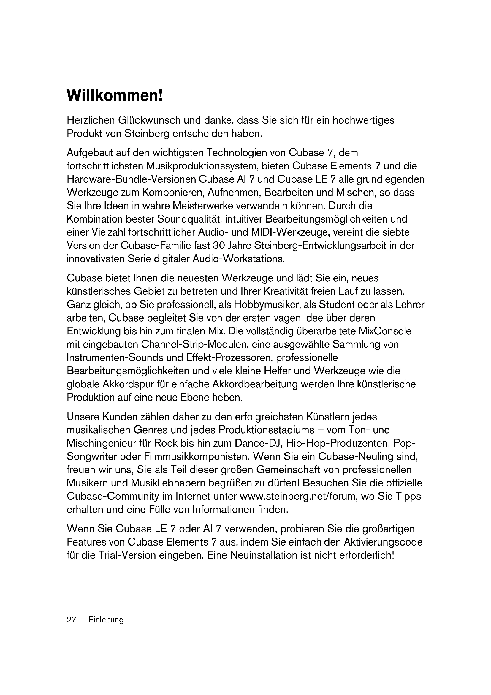 Einleitung Quick_Start_Guide_DeEnEsFrIt.book Page 26 Tuesday, April 23, 2013 10:53 AM27 — Einleitung Willkommen! Herzlichen Glückwunsch und danke, dass Sie sich für ein hochwertiges Produkt von Steinberg entscheiden haben. Aufgebaut auf den wichtigsten Technologien von Cubase 7, dem fortschrittlichsten Musikproduktionssystem, bieten Cubase Elements 7 und die Hardware-Bundle-Versionen Cubase AI 7 und Cubase LE 7 alle grundlegenden Werkzeuge zum Komponieren, Aufnehmen, Bearbeiten und Mischen, so dass Sie Ihre Ideen in wahre Meisterwerke verwandeln können. Durch die Kombination bester Soundqualität, intuitiver Bearbeitungsmöglichkeiten und einer Vielzahl fortschrittlicher Audio- und MIDI-Werkzeuge, vereint die siebte Version der Cubase-Familie fast 30 Jahre Steinberg-Entwicklungsarbeit in der innovativsten Serie digitaler Audio-Workstations. Cubase bietet Ihnen die neuesten Werkzeuge und lädt Sie ein, neues künstlerisches Gebiet zu betreten und Ihrer Kreativität freien Lauf zu lassen. Ganz gleich, ob Sie professionell, als Hobbymusiker, als Student oder als Lehrer arbeiten, Cubase begleitet Sie von der ersten vagen Idee über deren Entwicklung bis hin zum finalen Mix. Die vollständig überarbeitete MixConsole mit eingebauten Channel-Strip-Modulen, eine ausgewählte Sammlung von Instrumenten-Sounds und Effekt-Prozessoren, professionelle Bearbeitungsmöglichkeiten und viele kleine Helfer und Werkzeuge wie die globale Akkordspur für einfache Akkordbearbeitung werden Ihre künstlerische Produktion auf eine neue Ebene heben. Unsere Kunden zählen daher zu den erfolgreichsten Künstlern jedes musikalischen Genres und jedes Produktionsstadiums – vom Ton- und Mischingenieur für Rock bis hin zum Dance-DJ, Hip-Hop-Produzenten, Pop- Songwriter oder Filmmusikkomponisten. Wenn Sie ein Cubase-Neuling sind, freuen wir uns, Sie als Teil dieser großen Gemeinschaft von professionellen Musikern und Musikliebhabern begrüßen zu dürfen! Besuchen Sie die offizielle Cubase-Community im Internet unter www.steinberg.net/forum, wo Sie Tipps erhalten und eine Fülle von Informationen finden. Wenn Sie Cubase LE 7 oder AI 7 verwenden, probieren Sie die großartigen Features von Cubase Elements 7 aus, indem Sie einfach den Aktivierungscode für die Trial-Version eingeben. Eine Neuinstallation ist nicht erforderlich! Quick_Start_Guide_DeEnEsFrIt.book Page 27 Tuesday, April 23, 2013 10:53 AMEinleitung — 28 DEUTSCH Vergessen Sie nicht, Ihre Cubase-Version auf MySteinberg zu registrieren. So erhalten Sie Zugang zu Online-Support-Angeboten und zusätzlichen Serviceleistungen. Wir wünschen Ihnen musikalische Inspiration beim Arbeiten mit Ihrer brandneuen Cubase-DAW. Wir freuen uns auf Sie! Das Steinberg Cubase-Team Die Dokumentation und die Hilfe Die verschiedenen Bestandteile der Dokumentation von Cubase sind im Folgenden aufgelistet. Die Dokumente sind im Format Adobe Acrobat (Dateinamenerweiterung .pdf) verfügbar und können wie folgt aufgerufen werden: