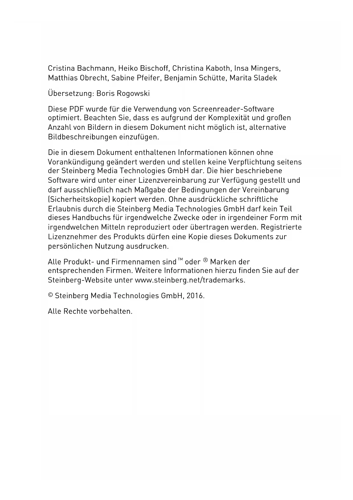 automatically, open the Device Port pop-up menu and select different ports. RESULT You are now ready to record audio in Cubase and play it back. 14System Requirements and Installation System Setup NOTE To get started with Cubase, we recommend watching the video tutorials on the Steinberg YouTube Channel including a demonstration of the new features of Cubase. 15DeutschCristina Bachmann, Heiko Bischoff, Christina Kaboth, Insa Mingers, Matthias Obrecht, Sabine Pfeifer, Benjamin Schütte, Marita Sladek Übersetzung: Boris Rogowski Diese PDF wurde für die Verwendung von Screenreader-Software optimiert. Beachten Sie, dass es aufgrund der Komplexität und großen Anzahl von Bildern in diesem Dokument nicht möglich ist, alternative Bildbeschreibungen einzufügen. Die in diesem Dokument enthaltenen Informationen können ohne Vorankündigung geändert werden und stellen keine Verpflichtung seitens der Steinberg Media Technologies GmbH dar. Die hier beschriebene Software wird unter einer Lizenzvereinbarung zur Verfügung gestellt und darf ausschließlich nach Maßgabe der Bedingungen der Vereinbarung (Sicherheitskopie) kopiert werden. Ohne ausdrückliche schriftliche Erlaubnis durch die Steinberg Media Technologies GmbH darf kein Teil dieses Handbuchs für irgendwelche Zwecke oder in irgendeiner Form mit irgendwelchen Mitteln reproduziert oder übertragen werden. Registrierte Lizenznehmer des Produkts dürfen eine Kopie dieses Dokuments zur persönlichen Nutzung ausdrucken. Alle Produkt- und Firmennamen sind