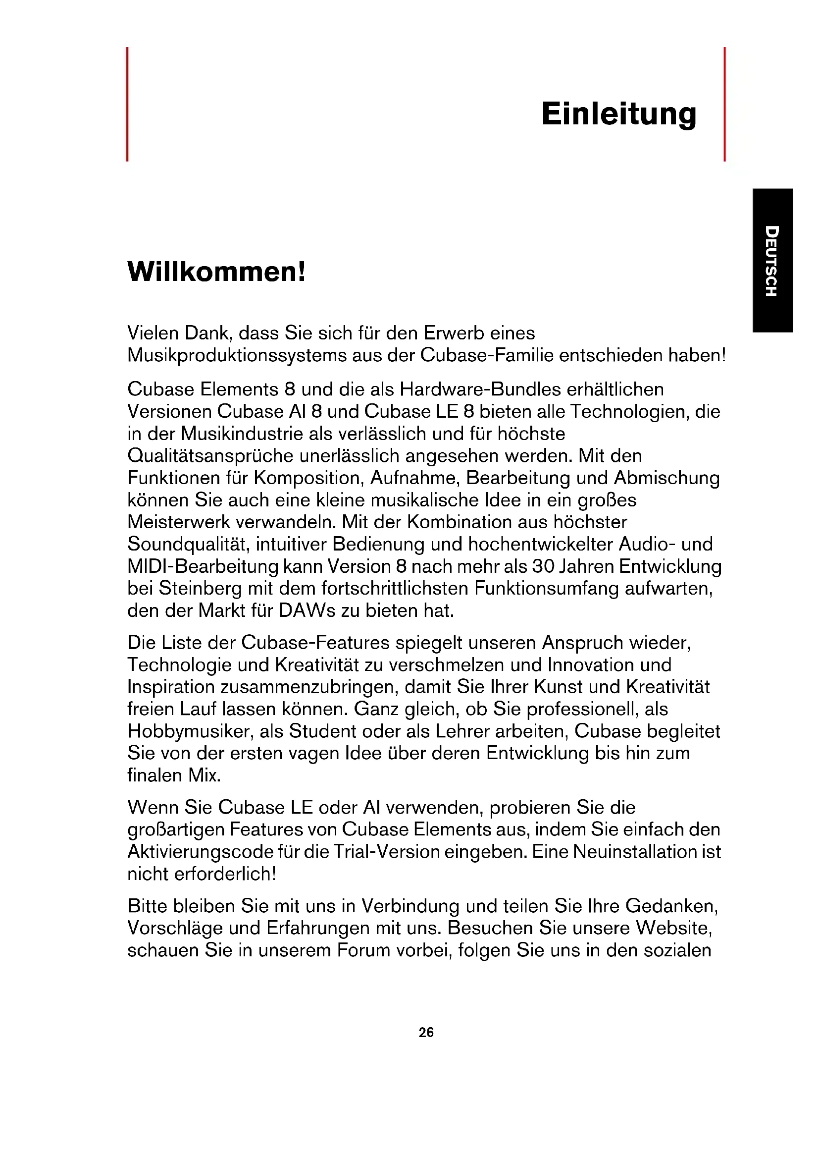 NOTE To get started with Cubase, we recommend watching the video tutorials on the Steinberg YouTube Channel including a demonstration of the new features of Cubase.DeutschCristina Bachmann, Heiko Bischoff, Christina Kaboth, Insa Mingers, Matthias Obrecht, Sabine Pfeifer, Kevin Quarshie, Benjamin Schütte Diese PDF wurde für die Verwendung von Screenreader-Software optimiert. Beachten Sie, dass es aufgrund der Komplexität und großen Anzahl von Bildern in diesem Dokument nicht möglich ist, alternative Bildbeschreibungen einzufügen. Die in diesem Dokument enthaltenen Informationen können ohne Vorankündigung geändert werden und stellen keine Verpflichtung seitens der Steinberg Media Technologies GmbH dar. Die hier beschriebene Software wird unter einer Lizenzvereinbarung zur Verfügung gestellt und darf ausschließlich nach Maßgabe der Bedingungen der Vereinbarung (Sicherheitskopie) kopiert werden. Ohne ausdrückliche schriftliche Erlaubnis durch die Steinberg Media Technologies GmbH darf kein Teil dieses Handbuchs für irgendwelche Zwecke oder in irgendeiner Form mit irgendwelchen Mitteln reproduziert oder übertragen werden. Registrierte Lizenznehmer des Produkts dürfen eine Kopie dieses Dokuments zur persönlichen Nutzung ausdrucken. Alle Produkt- und Firmennamen sind ™ oder ® Marken der entsprechenden Firmen. Weitere Informationen hierzu finden Sie auf der Steinberg-Website unter www.steinberg.net/trademarks. © Steinberg Media Technologies GmbH, 2015. Alle Rechte vorbehalten.24 DEUTSCH Inhaltsverzeichnis 26 Einleitung 26 Willkommen! 27 Die Dokumentation und die Hilfe 29 Typographische Konventionen 30 So können Sie uns erreichen 32 Systemanforderungen und Installation 32 Systemanforderungen 33 Programm installieren 34 Lizenzaktivierung 36 Hardware-Installation 39 System einrichten2526 DEUTSCH Einleitung Willkommen! Vielen Dank, dass Sie sich für den Erwerb eines Musikproduktionssystems aus der Cubase-Familie entschieden haben! Cubase Elements 8 und die als Hardware-Bundles erhältlichen Versionen Cubase AI 8 und Cubase LE 8 bieten alle Technologien, die in der Musikindustrie als verlässlich und für höchste Qualitätsansprüche unerlässlich angesehen werden. Mit den Funktionen für Komposition, Aufnahme, Bearbeitung und Abmischung können Sie auch eine kleine musikalische Idee in ein großes Meisterwerk verwandeln. Mit der Kombination aus höchster Soundqualität, intuitiver Bedienung und hochentwickelter Audio- und MIDI-Bearbeitung kann Version 8 nach mehr als 30 Jahren Entwicklung bei Steinberg mit dem fortschrittlichsten Funktionsumfang aufwarten, den der Markt für DAWs zu bieten hat. Die Liste der Cubase-Features spiegelt unseren Anspruch wieder, Technologie und Kreativität zu verschmelzen und Innovation und Inspiration zusammenzubringen, damit Sie Ihrer Kunst und Kreativität freien Lauf lassen können. Ganz gleich, ob Sie professionell, als Hobbymusiker, als Student oder als Lehrer arbeiten, Cubase begleitet Sie von der ersten vagen Idee über deren Entwicklung bis hin zum finalen Mix. Wenn Sie Cubase LE oder AI verwenden, probieren Sie die großartigen Features von Cubase Elements aus, indem Sie einfach den Aktivierungscode für die Trial-Version eingeben. Eine Neuinstallation ist nicht erforderlich! Bitte bleiben Sie mit uns in Verbindung und teilen Sie Ihre Gedanken, Vorschläge und Erfahrungen mit uns. Besuchen Sie unsere Website, schauen Sie in unserem Forum vorbei, folgen Sie uns in den sozialenEinleitung Die Dokumentation und die Hilfe