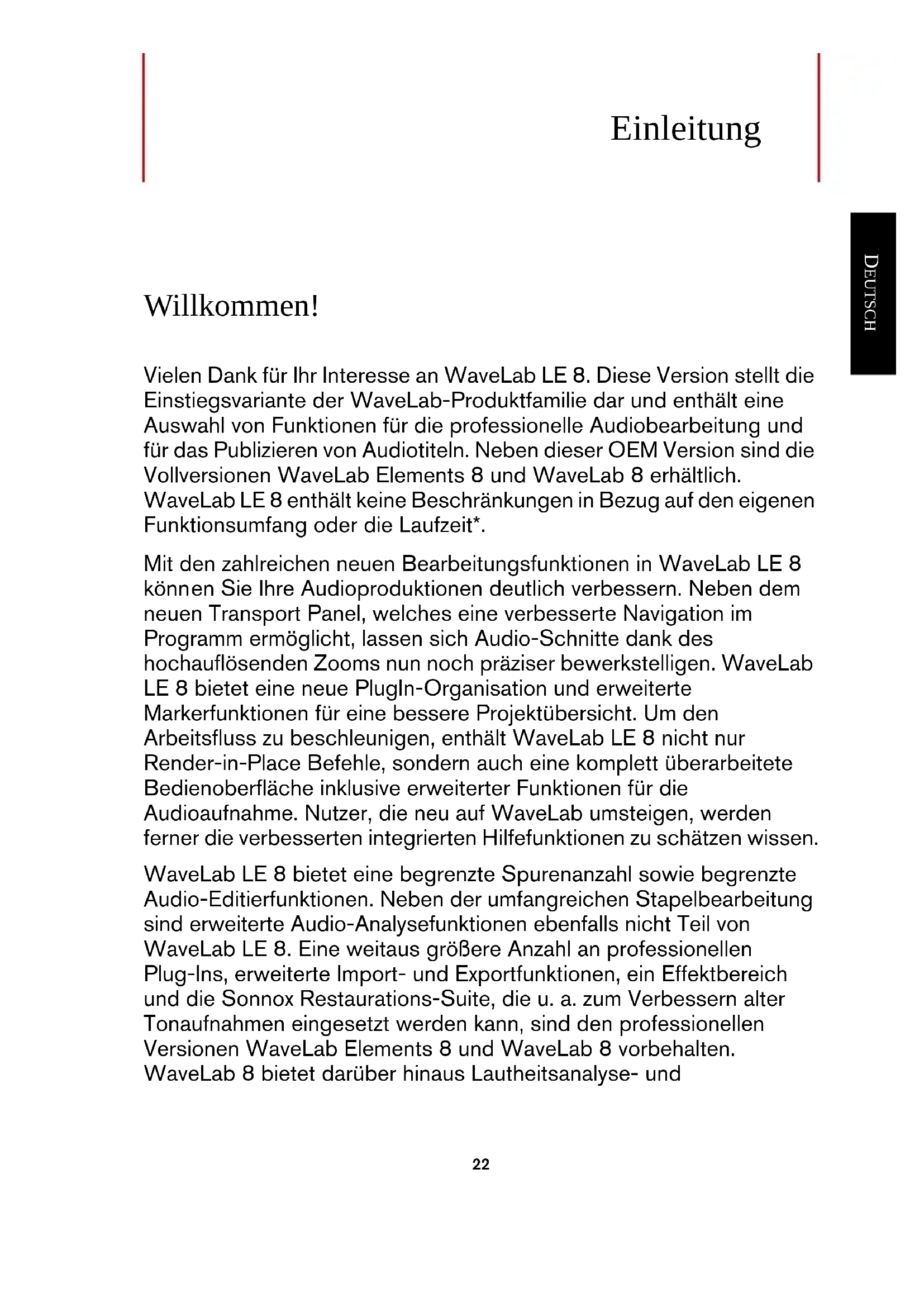 eitere Informationen hierzu finden Sie auf der Steinberg-Website unter www.steinberg.net/trademarks. Stand: 18. Juni 2013 © Steinberg Media Technologies GmbH, 2013. Alle Rechte vorbehalten.20 DEUTSCH Inhaltsverzeichnis 22 Einleitung 22 Willkommen! 23 Die Dokumentation und die Hilfe 25 Typographische Konventionen 26 So können Sie uns erreichen 28 Systemanforderungen und Installation 28 Systemanforderungen 29 Programminstallation 30 Registrierung und Lizenzaktivierung 32 Hardware-Installation 35 System einrichten2122 DEUTSCH Einleitung Willkommen! Vielen Dank für Ihr Interesse an WaveLab LE 8. Diese Version stellt die Einstiegsvariante der WaveLab-Produktfamilie dar und enthält eine Auswahl von Funktionen für die professionelle Audiobearbeitung und für das Publizieren von Audiotiteln. Neben dieser OEM Version sind die Vollversionen WaveLab Elements 8 und WaveLab 8 erhältlich. WaveLab LE 8 enthält keine Beschränkungen in Bezug auf den eigenen Funktionsumfang oder die Laufzeit*. Mit den zahlreichen neuen Bearbeitungsfunktionen in WaveLab LE 8 könn en Sie Ihre Audioproduktionen deutlich verbessern. Neben dem neuen Transport Panel, welches eine verbesserte Navigation im Programm ermöglicht, lassen sich Audio-Schnitte dank des hochauflösenden Zooms nun noch präziser bewerkstelligen. WaveLab LE 8 bietet eine neue PlugIn-Organisation und erweiterte Markerfunktionen für eine bessere Projektübersicht. Um den Arbeitsfluss zu beschleunigen, enthält WaveLab LE 8 nicht nur Render-in-Place Befehle, sondern auch eine komplett überarbeitete Bedienoberfläche inklusive erweiterter Funktionen für die Audioaufnahme. Nutzer, die neu auf WaveLab umsteigen, werden ferner die verbesserten integrierten Hilfefunktionen zu schätzen wissen. WaveLab LE 8 bietet eine begrenzte Spurenanzahl sowie begrenzte Audio-Editierfunktionen. Neben der umfangreichen Stapelbearbeitung sind erweiterte Audio-Analysefunktionen ebenfalls nicht Teil von WaveLab LE 8. Eine weitaus größere Anzahl an professionellen Plug-Ins, erweiterte Import- und Exportfunktionen, ein Effektbereich und die Sonnox Restaurations-Suite, die u. a. zum Verbessern alter Tonaufnahmen eingesetzt werden kann, sind den professionellen Versionen WaveLab Elements 8 und WaveLab 8 vorbehalten. WaveLab 8 bietet darüber hinaus Lautheitsanalyse- undEinleitung Die Dokumentation und die Hilfe