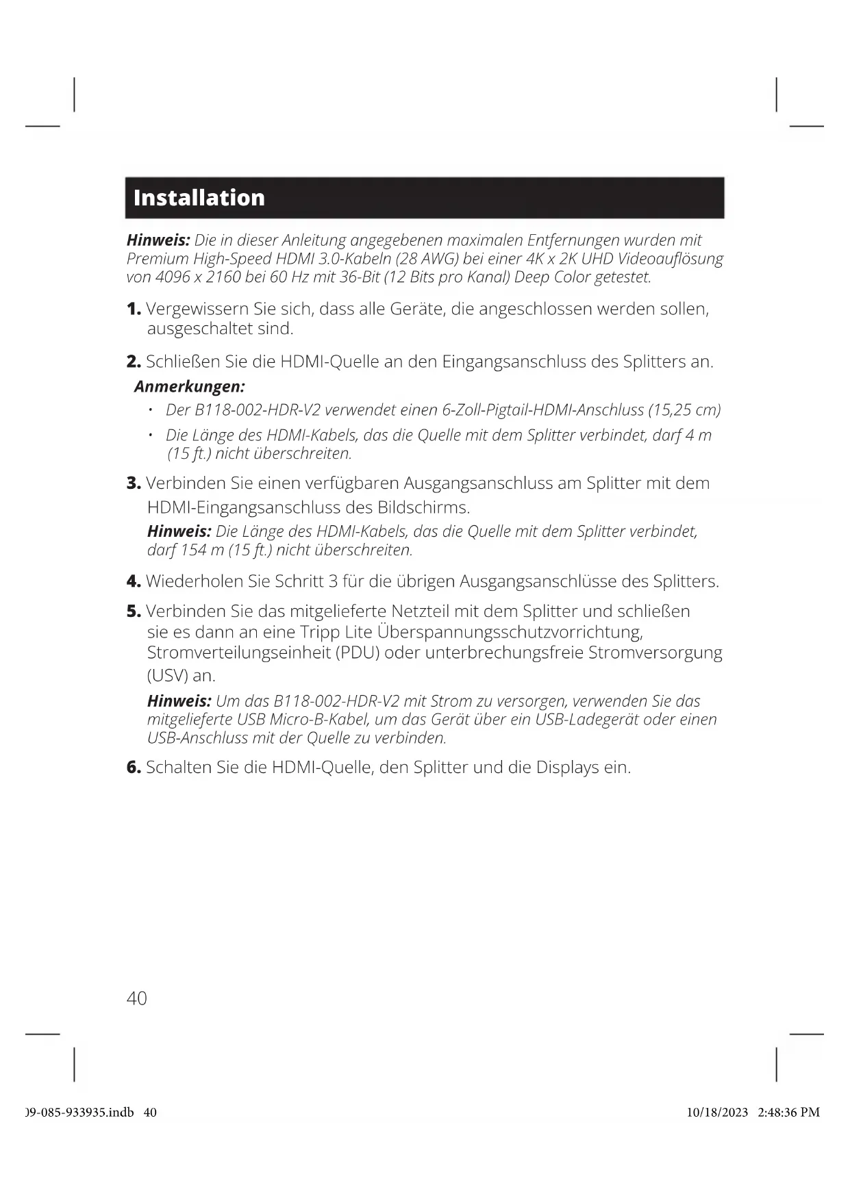 - P569-015-CERTPremiumHigh-SpeedHDMI-Kabel–4,6m(15ft.) Optionales Zubehör 23-09-085-933935.indb 3923-09-085-933935.indb 39 10/18/2023 2:48:36 PM10/18/2023 2:48:36 PM40 Installation Hinweis: Die in dieser Anleitung angegebenen maximalen Entfernungen wurden mit Premium High-Speed HDMI 3.0-Kabeln (28 AWG) bei einer 4K x 2K UHD Videoauösung von 4096 x 2160 bei 60 Hz mit 36-Bit (12 Bits pro Kanal) Deep Color getestet. 1.VergewissernSiesich,dassalleGeräte,dieangeschlossenwerdensollen, ausgeschaltet sind. 2.SchließenSiedieHDMI-QuelleandenEingangsanschlussdesSplittersan. Anmerkungen: