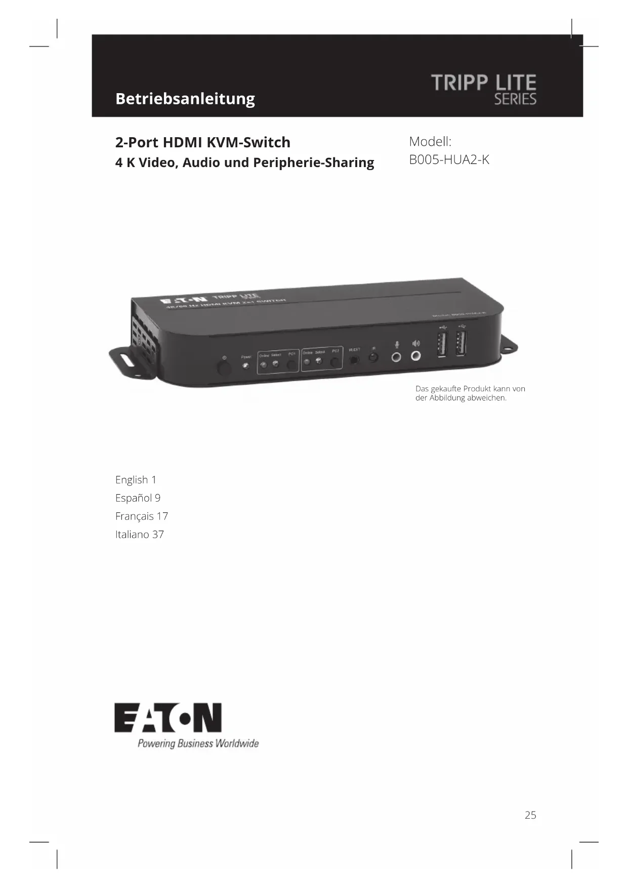 Wir garantieren, dass unsere Produkte frei von Material- und Verarbeitungsfehlern sind, und zwar für einenZeitraumvondrei(3)JahrenabdemDatumdesErstkaufs.UnsereVerpichtungimRahmendieser Garantie beschränkt sich auf die Reparatur oder den Ersatz (nach eigenem Ermessen) der fehlerhaften Produkte. Besuchen Sie Tripplite.Eaton.com/support/product-returns, bevor Sie Geräte zur Reparatur zurücksenden. Diese Garantie gilt nicht für Geräte, die durch Unfall, Fahrlässigkeit oder falsche Anwendung beschädigtwurdenoderinirgendeinerWeisegeändertodermodiziertwurden. MIT AUSNAHME DER HIERIN ENTHALTENEN BESTIMMUNGEN GEBEN WIR KEINE GARANTIEN, WEDER AUSDRÜCKLICH NOCH STILLSCHWEIGEND, EINSCHLIESSLICH GARANTIEN DER MARKTGÄNGIGKEIT UND EIGNUNG FÜR EINEN BESTIMMTEN ZWECK. Einige Staaten gestatten keine Beschränkung oder keinen Ausschluss stillschweigender Gewährleistungen; daher kann es sein, dass die oben genannten BeschränkungenoderAusschlüsseaufdenKäufernichtzutreen.