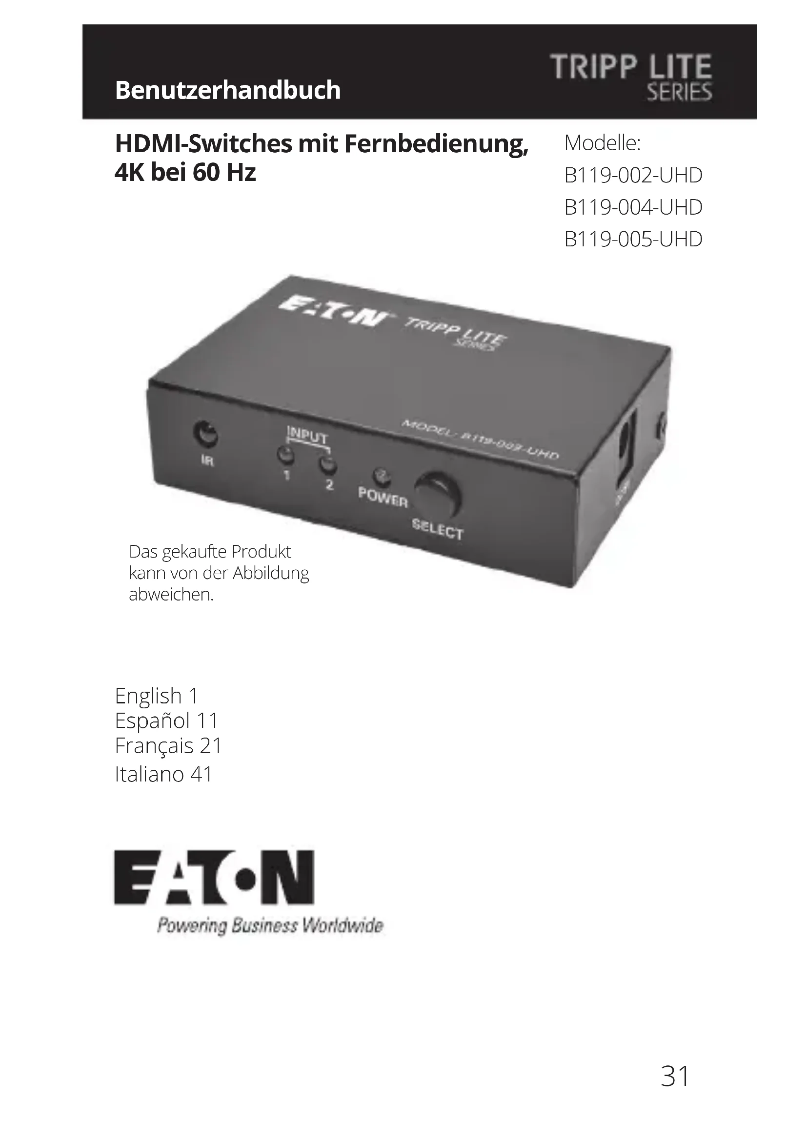 - Rücksendung neuer Geräte zum Recycling, wenn ihr Lebenszyklus abgelaufen ist Die Verwendung dieses Geräts für Lebenserhaltungssysteme, bei denen der Ausfall des Geräts den Ausfall des Lebenserhaltungssystems verursachen oder dessen Sicherheit beziehungsweise Wirksamkeit erheblich beeinträchtigen kann, wird nicht empfohlen. Eaton verfolgt eine Politik der kontinuierlichen Verbesserung. Spezikationen können ohne Ankündigung geändert werden. Garantie Eaton 1000Eaton Boulevard Cleveland, OH44122 Vereinigte Staaten Eaton.com ©2024 Eaton Alle Rechte vorbehalten. Publikationsnr. 23-10-095 / 93-37C3_RevE Marsch 2024 Eaton ist eine eingetragene Marke. Alle Marken sind Eigentum der jeweiligen Inhaber. 9337C341 Manuale d'uso English 1 Español 11 Français 21 Deutsch 31 Il prodotto acquistato può differire dall'immagine. Modelli: