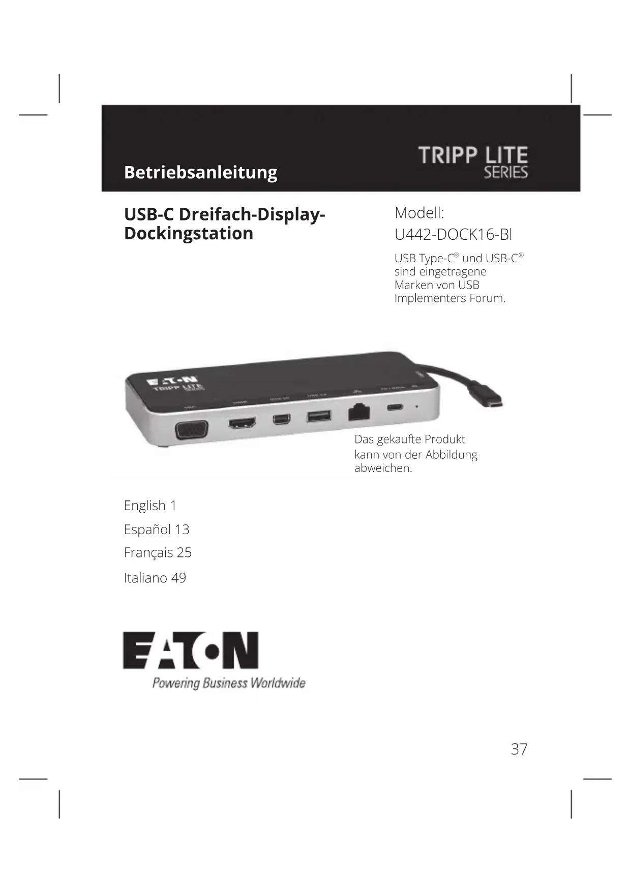 - DisplayPort Specication 1,2. Max. Unterstützte Videoauösungen HDMI (4096 x 2160 bei 30 Hz) Mini DisplayPort (4096 x 2160 bei 30 Hz) VGA (1920 x 1200 bei 60 Hz) Netzwerk-Geschwindigkeit 10/100/1000 Mbps oder 1 Gbps Unterstützte Farbtiefe (HDMI) 36 Bit (12 Bits pro Kanal) Farbunterabtastung (HDMI) YCbCr: 4:4:4, 4:2:2, 4:2:0 PD-Auadung Spezika- tion PD 3,0 (60 W)45 Fehlerbehebung Warum kann keine Auösung von 4096 x 2160 bei 30 Hz angezeigt werden? A. Klicken Sie auf [Anzeigeeinstellung] > [Erweiterte Anzeigeeinstellungen] und wählen Sie die gewünschte Auösung manuell aus. B. Vergewissern Sie sich, dass das Gerät, der Bildschirm und das Kabel alle 4096 x 2160 bei 30 Hz HD unterstützen. Warum variiert meine PD-Auadezeit? Das vorgelagerte Gerät (Laptop) passt die Leistungsaufnahme automatisch an den aktuellen Batteriestand an. Warum werden auf meinen HDMI-, Mini DisplayPort - und VGA-Bildschirmen keine unterschiedlichen Bildschirme angezeigt? Die meisten MacBook-Laptops unterstützen MST nicht, sodass Sie nur einen Bildschirm erweitern und den anderen spiegeln können.46 3Jahre eingeschränkte Garantie Wir garantieren, dass unsere Produkte frei von Material- und Verarbeitungsfehlern sind, und zwar für einen Zeitraum von drei (3) Jahren ab dem Datum des Erstkaufs. Unsere Verpichtung im Rahmen dieser Garantie beschränkt sich auf die Reparatur oder den Ersatz (nach eigenem Ermessen) der fehlerhaften Produkte. Besuchen Sie Tripplite.Eaton.com/support/product-returns, bevor Sie Geräte zur Reparatur zurücksenden. Diese Garantie gilt nicht für Geräte, die durch Unfall, Fahrlässigkeit oder falsche Anwendung beschädigt wurden oder in irgendeiner Weise geändert oder modiziert wurden.