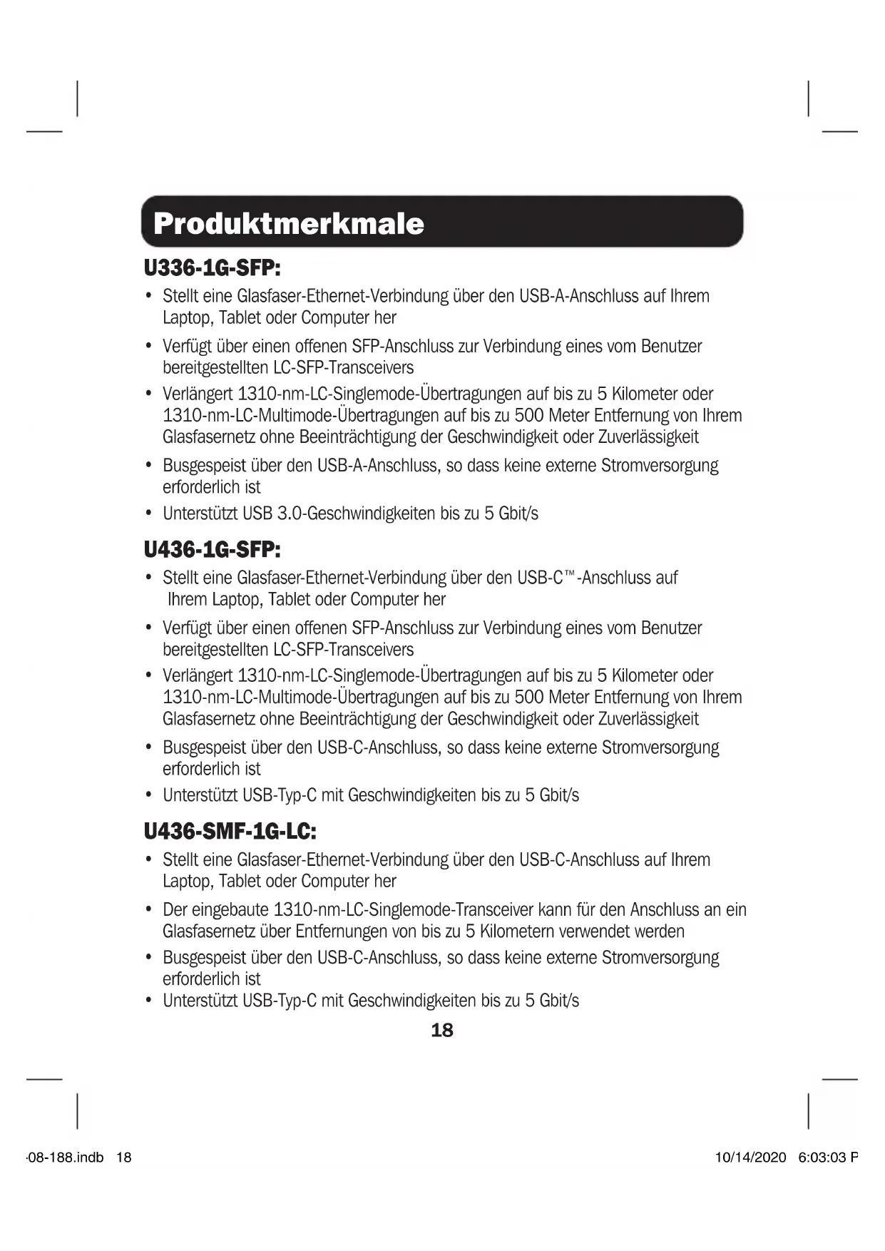 - Unterstützt USB-Typ-C mit Geschwindigkeiten bis zu 5 Gbit/s U436-SMF-1G-LC:
