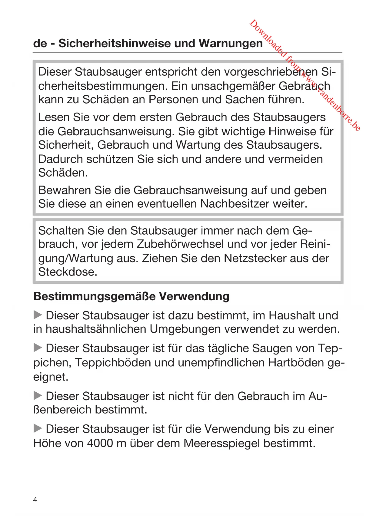 Dieser Staubsauger entspricht den vorgeschriebenen Si- cherheitsbestimmungen. Ein unsachgemäßer Gebrauch kann zu Schäden an Personen und Sachen führen. Lesen Sie vor dem ersten Gebrauch des Staubsaugers die Gebrauchsanweisung. Sie gibt wichtige Hinweise für Sicherheit, Gebrauch und Wartung des Staubsaugers. Dadurch schützen Sie sich und andere und vermeiden Schäden. Bewahren Sie die Gebrauchsanweisung auf und geben Sie diese an einen eventuellen Nachbesitzer weiter. Schalten Sie den Staubsauger immer nach dem Ge- brauch, vor jedem Zubehörwechsel und vor jeder Reini- gung/Wartung aus. Ziehen Sie den Netzstecker aus der Steckdose. Bestimmungsgemäße Verwendung Dieser Staubsauger ist dazu bestimmt, im Haushalt und in haushaltsähnlichen Umgebungen verwendet zu werden. Dieser Staubsauger ist für das tägliche Saugen von Tep- pichen, Teppichböden und unempfindlichen Hartböden ge- eignet. Dieser Staubsauger ist nicht für den Gebrauch im Au- ßenbereich bestimmt. Dieser Staubsauger ist für die Verwendung bis zu einer Höhe von 4000 m über dem Meeresspiegel bestimmt. Downloaded from www.vandenborre.bede - Sicherheitshinweise und Warnungen
