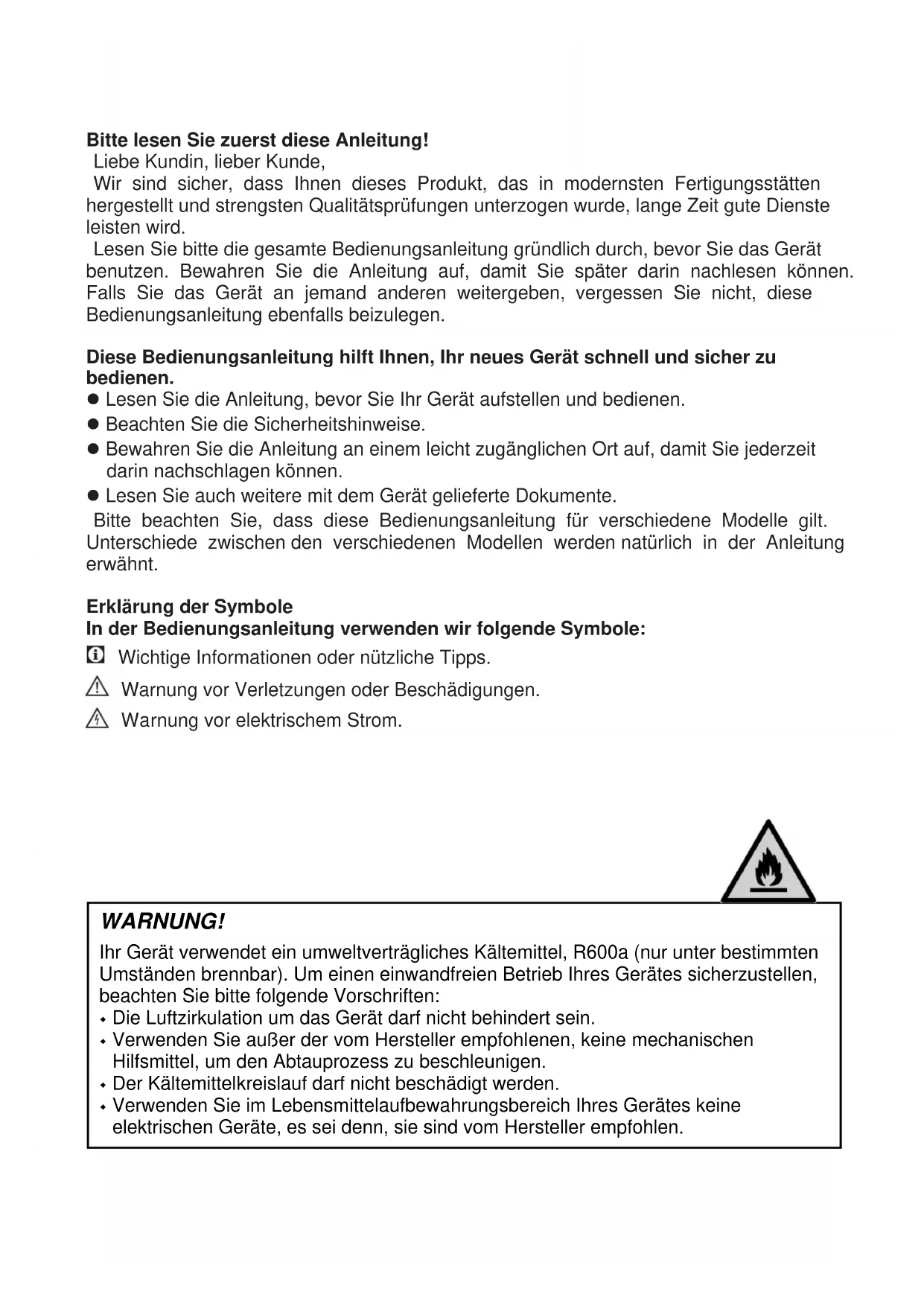 - Kühlschrank - Gefrierschrank Gebrauchsanweisung Congélateur - Réfrigérateur Notice d’utilisation Frigider - Congelator Instrucţiuni de utilizare Chladnička - Mrazák Pokyny pro používání Chladnička - Mraznička Návod na použitie D-FR-RO-CZ-SKBitte lesen Sie zuerst diese Anleitung! Liebe Kundin, lieber Kunde, Wir sind sicher, dass Ihnen dieses Produkt, das in modernsten Fertigungsstätten hergestellt und strengsten Qualitätsprüfungen unterzogen wurde, lange Zeit gute Dienste leisten wird. Lesen Sie bitte die gesamte Bedienungsanleitung gründlich durch, bevor Sie das Gerät benutzen. Bewahren Sie die Anleitung auf, damit Sie später darin nachlesen können. Falls Sie das Gerät an jemand anderen weitergeben, vergessen Sie nicht, diese Bedienungsanleitung ebenfalls beizulegen. Diese Bedienungsanleitung hilft Ihnen, Ihr neues Gerät schnell und sicher zu bedienen. Lesen Sie die Anleitung, bevor Sie Ihr Gerät aufstellen und bedienen. Beachten Sie die Sicherheitshinweise. Bewahren Sie die Anleitung an einem leicht zugänglichen Ort auf, damit Sie jederzeit darin nachschlagen können. Lesen Sie auch weitere mit dem Gerät gelieferte Dokumente. Bitte beachten Sie, dass diese Bedienungsanleitung für verschiedene Modelle gilt. Unterschiede zwischen den verschiedenen Modellen werden natürlich in der Anleitung erwähnt. Erklärung der Symbole In der Bedienungsanleitung verwenden wir folgende Symbole: Wichtige Informationen oder nützliche Tipps. Warnung vor Verletzungen oder Beschädigungen. Warnung vor elektrischem Strom. WARNUNG! Ihr Gerät verwendet ein umweltverträgliches Kältemittel, R600a (nur unter bestimmten Umständen brennbar). Um einen einwandfreien Betrieb Ihres Gerätes sicherzustellen, beachten Sie bitte folgende Vorschriften: Die Luftzirkulation um das Gerät darf nicht behindert sein. Verwenden Sie außer der vom Hersteller empfohlenen, keine mechanischen Hilfsmittel, um den Abtauprozess zu beschleunigen. Der Kältemittelkreislauf darf nicht beschädigt werden. Verwenden Sie im Lebensmittelaufbewahrungsbereich Ihres Gerätes keine elektrischen Geräte, es sei denn, sie sind vom Hersteller empfohlen.INHALT 2 D 4 Vorbereitung 10 5 So nutzen Sie Ihren Kühlschrank 11 Thermostateinstelltaste p. 11