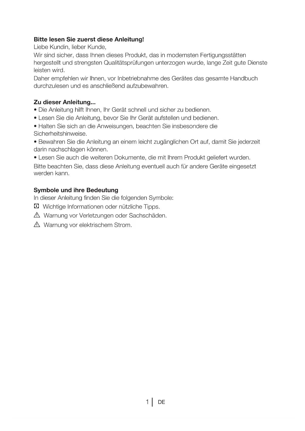 - Lesen Sie auch die weiteren Dokumente, die mit Ihrem Produkt geliefert wurden. Bitte beachten Sie, dass diese Anleitung eventuell auch für andere Geräte eingesetzt werden kann. Symbole und ihre Bedeutung In dieser Anleitung finden Sie die folgenden Symbole: C Wichtige Informationen oder nützliche Tipps. A Warnung vor Verletzungen oder Sachschäden. B Warnung vor elektrischem Strom.DE