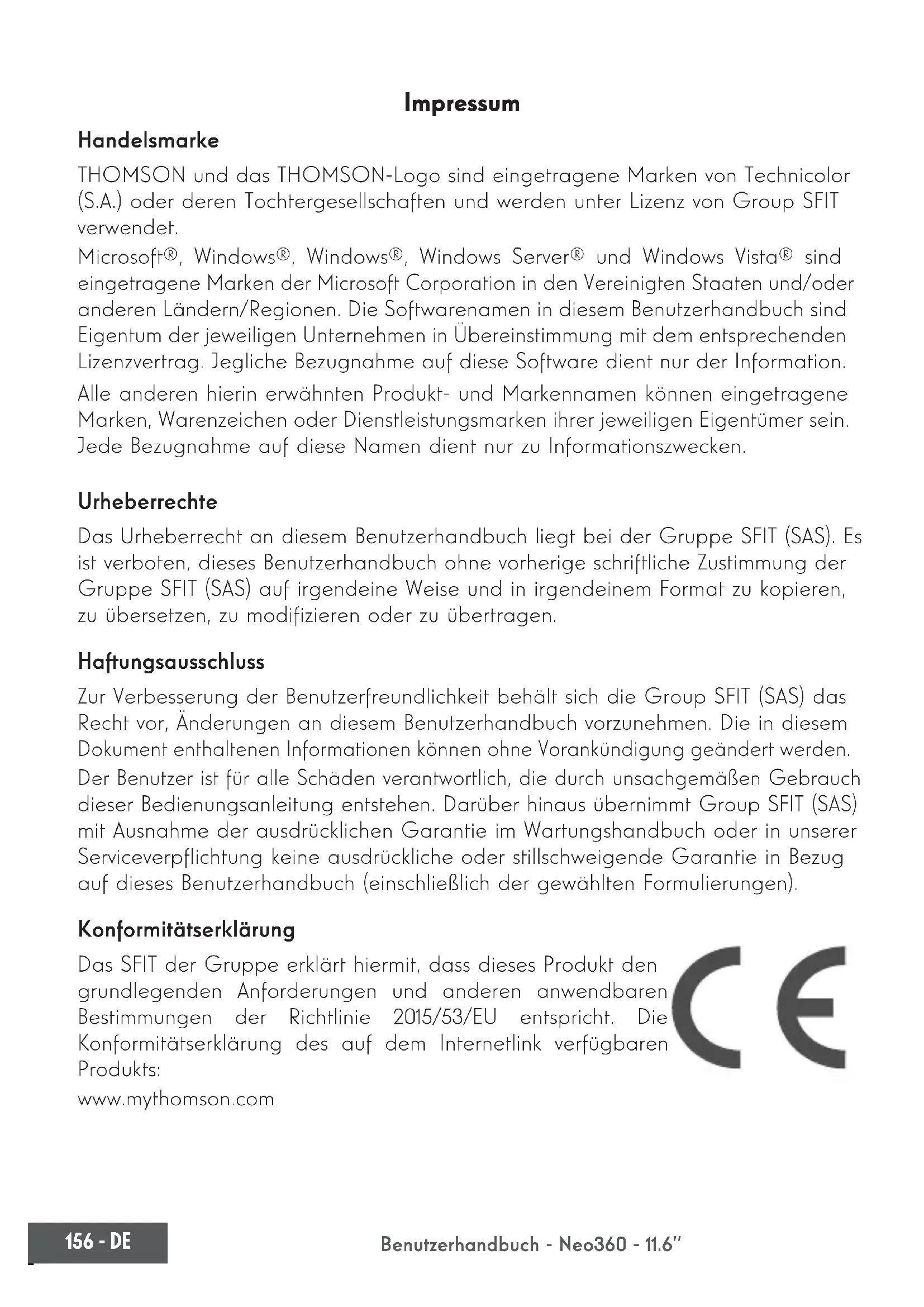 Benutzerhandbuch - Neo360 - 11.6’’ mythomson.com Impressum Handelsmarke THOMSON und das THOMSON-Logo sind eingetragene Marken von Technicolor (S.A.) oder deren Tochtergesellschaften und werden unter Lizenz von Group SFIT verwendet. Microsoft®, Windows®, Windows®, Windows Server® und Windows Vista® sind eingetragene Marken der Microsoft Corporation in den Vereinigten Staaten und/oder anderen Ländern/Regionen. Die Softwarenamen in diesem Benutzerhandbuch sind Eigentum der jeweiligen Unternehmen in Übereinstimmung mit dem entsprechenden Lizenzvertrag. Jegliche Bezugnahme auf diese Software dient nur der Information. Alle anderen hierin erwähnten Produkt- und Markennamen können eingetragene Marken, Warenzeichen oder Dienstleistungsmarken ihrer jeweiligen Eigentümer sein. Jede Bezugnahme auf diese Namen dient nur zu Informationszwecken. Urheberrechte Das Urheberrecht an diesem Benutzerhandbuch liegt bei der Gruppe SFIT (SAS). Es ist verboten, dieses Benutzerhandbuch ohne vorherige schriftliche Zustimmung der Gruppe SFIT (SAS) auf irgendeine Weise und in irgendeinem Format zu kopieren, zu übersetzen, zu modizieren oder zu übertragen. Haftungsausschluss Zur Verbesserung der Benutzerfreundlichkeit behält sich die Group SFIT (SAS) das Recht vor, Änderungen an diesem Benutzerhandbuch vorzunehmen. Die in diesem Dokument enthaltenen Informationen können ohne Vorankündigung geändert werden. Der Benutzer ist für alle Schäden verantwortlich, die durch unsachgemäßen Gebrauch dieser Bedienungsanleitung entstehen. Darüber hinaus übernimmt Group SFIT (SAS) mit Ausnahme der ausdrücklichen Garantie im Wartungshandbuch oder in unserer Serviceverpichtung keine ausdrückliche oder stillschweigende Garantie in Bezug auf dieses Benutzerhandbuch (einschließlich der gewählten Formulierungen). Konformitätserklärung Das SFIT der Gruppe erklärt hiermit, dass dieses Produkt den grundlegenden Anforderungen und anderen anwendbaren Bestimmungen der Richtlinie 2015/53/EU entspricht. Die Konformitätserklärung des auf dem Internetlink verfügbaren Produkts: www.mythomson.comDE - 157 mythomson.com - Wichtige Sicherheitshinweise - Dieses Gerät sollte in einer Umgebung mit einer Umgebungstemperatur zwischen 5°C (41°F) und 35°C (95°F) eingesetzt werden. Setzen Sie das Gerät weder Regen noch Feuchtigkeit aus und halten Sie es von Flüssigkeiten fern. Wenn Wasser oder andere Flüssigkeiten auf das Gerät spritzen, schalten Sie das Gerät sofort aus und warten Sie, bis es vollständig trocken ist, bevor Sie es wieder einschalten. Setzen Sie das Gerät nicht direkt der Sonneneinstrahlung aus. Verwenden Sie keine starken Lösungsmittel, üssigen Reinigungsmittel oder andere Chemikalien auf oder in der Nähe der Oberäche des Geräts, um Korrosion oder Beschädigung der Oberäche des Geräts zu vermeiden. Setzen Sie die Kamera nicht einer staubigen Umgebung aus. Verwenden Sie das Gerät nicht während eines Gaslecks. Setzen Sie das Gerät keinen starken magnetischen oder elektrischen Feldern aus. Sie können das Gerät über Flughafen-Röntgendetektoren betreiben. Es wird jedoch empfohlen, Ihr Gerät nicht durch die Magnetdetektionsportale zu führen oder es tragbaren Detektoren auszusetzen. Stellen Sie keine Gegenstände auf das Gerät. Stellen Sie das Gerät nicht auf eine unebene oder instabile Fläche. Achten Sie darauf, das Gerät vor Stürzen oder anderen Stößen zu schützen, die es beschädigen könnten. Lassen Sie das Gerät nicht auf Ihrem Schoß oder einem anderen Körperteil liegen oder auf ihn geladen, um die Gefahr von hitzebedingten Verletzungen zu vermeiden. Schalten Sie das Gerät vor dem Transport aus oder bedecken Sie es mit einem Material, das keine optimale Luftzirkulation zulässt. Verwenden Sie keine beschädigten Netzkabel, Zubehör oder andere Geräte mit Ihrem Gerät. Wir empfehlen die ausschließliche Verwendung des mitgelieferten Zubehörs (Netzteil, Kabel usw.).158 - DE Benutzerhandbuch - Neo360 - 11.6’’ mythomson.com Verwenden Sie nur Originalbatterien. Das Ersetzen der Batterie durch eine falsche Batterie kann zu einer Explosion führen. Demontieren, modizieren oder reparieren Sie das Gerät nicht selbst, da dies zum Erlöschen der Garantie führen kann. Bitte sichern Sie Ihre wichtigen Inhalte regelmäßig, um Datenverlust zu vermeiden. Unser Unternehmen übernimmt keine Verantwortung für den Verlust oder die Entfernung von Gegenständen, die im Gerät enthalten sind, aufgrund von unsachgemäßem Gebrauch der Hard- oder Software, mangelnder Wartung oder eines anderen zufälligen Ereignisses. Demontieren, modizieren oder reparieren Sie das Gerät nicht selbst, da dies zum Erlöschen der Garantie führen kann. Bitte sichern Sie Ihre wichtigen Inhalte regelmäßig, um Datenverlust zu vermeiden. Unser Unternehmen übernimmt keine Verantwortung für den Verlust oder die Entfernung von Gegenständen, die im Gerät enthalten sind, aufgrund von unsachgemäßem Gebrauch der Hard- oder Software, mangelnder Wartung oder eines anderen zufälligen Ereignisses. Bei voller Lautstärke kann ein längeres Hören des tragbaren Audiogeräts das Gehör des Benutzers beeinträchtigen. Dieses Produkt wurde entwickelt, um ein ordnungsgemäßes Recycling von Teilen und Komponenten zu ermöglichen. Das Symbol für einen durchgestrichenen Müllbehälter auf Rädern zeigt an, dass das Gerät nicht über den Hausmüll entsorgt werden darf. Beachten Sie die örtlichen Vorschriften für die Entsorgung von elektronischen Geräten. Das Symbol für einen durchgestrichenen Müllcontainer zeigt an, dass die Batterie nicht über den Hausmüll entsorgt werden darf. Beachten Sie die örtlichen Vorschriften für die Entsorgung von Batterien.DE - 159 mythomson.com