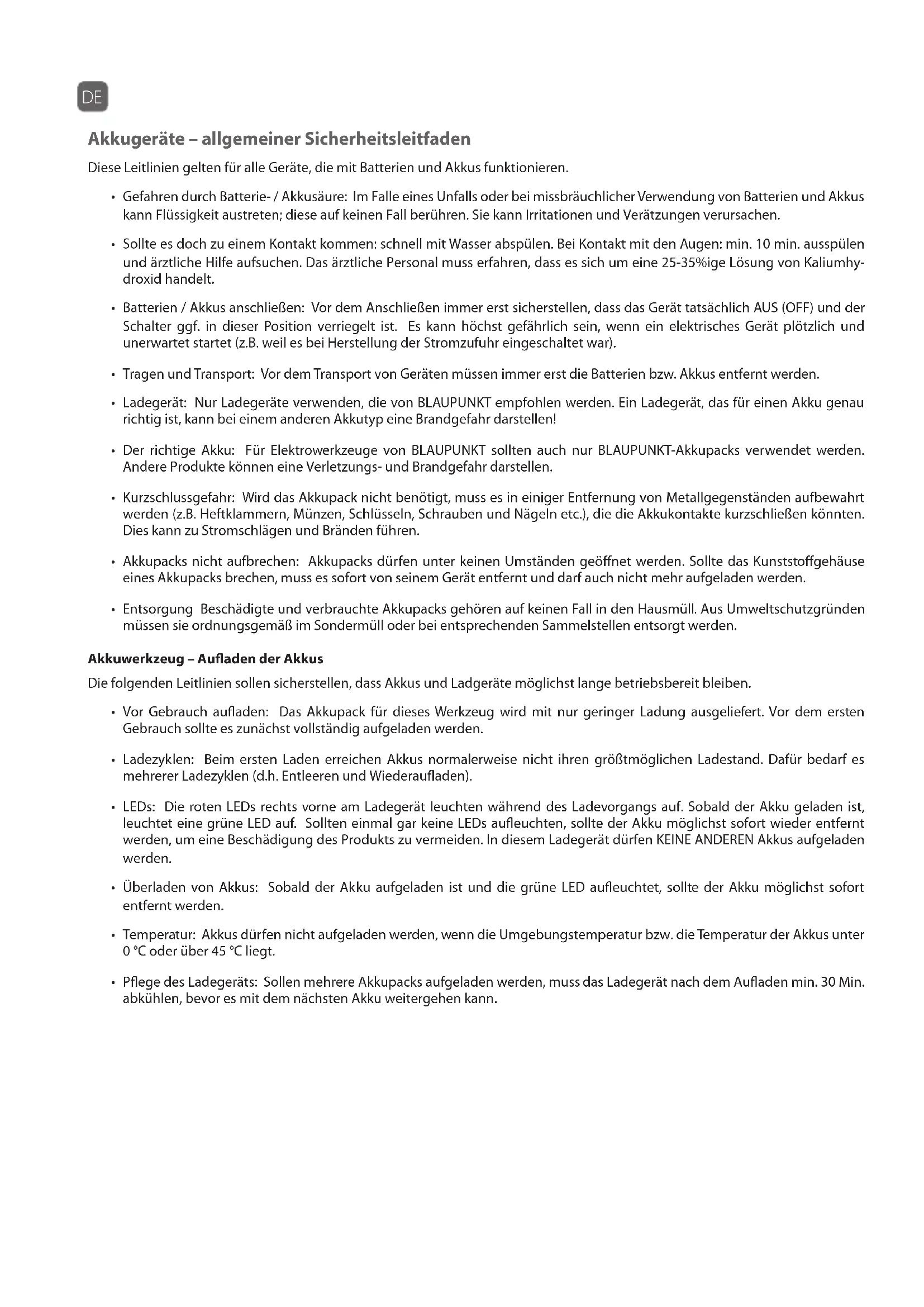 - Der richtige Akku: Für Elektrowerkzeuge von BLAUPUNKT sollten auch nur BLAUPUNKT-Akkupacks verwendet werden. Andere Produkte können eine Verletzungs- und Brandgefahr darstellen.