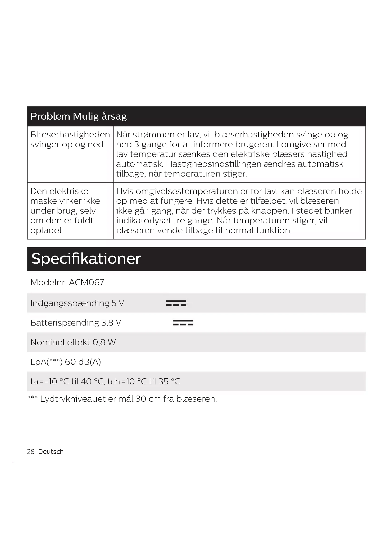 - Diese Masken sind nicht für Personen mit verringerten physischen, sensorischen oder psychischen Fähigkeiten oder einem Mangel an Erfahrung und Kenntnis vorgesehen, sofern sie nicht bei der Verwendung beaufsichtigt werden oder Anweisungen zum sicheren Gebrauch der Maske erhalten und die Gefahren verstanden haben. AMC067-AirMasks_3000.062.5277.2_BOOKLET_120x120mm_BW.indd 28AMC067-AirMasks_3000.062.5277.2_BOOKLET_120x120mm_BW.indd 28 01-03-21 11:2501-03-21 11:25Deutsch 29 Problem Mulig årsag Blæserhastigheden svinger op og ned Når strømmen er lav, vil blæserhastigheden svinge op og ned 3 gange for at informere brugeren. I omgivelser med lav temperatur sænkes den elektriske blæsers hastighed automatisk. Hastighedsindstillingen ændres automatisk tilbage, når temperaturen stiger. Den elektriske maske virker ikke under brug, selv om den er fuldt opladet Hvis omgivelsestemperaturen er for lav, kan blæseren holde op med at fungere. Hvis dette er tilfældet, vil blæseren ikke gå i gang, når der trykkes på knappen. I stedet blinker indikatorlyset tre gange. Når temperaturen stiger, vil blæseren vende tilbage til normal funktion. Specikationer Modelnr. ACM067 Indgangsspænding 5 V Batterispænding 3,8 V Nominel eekt 0,8 W LpA(***) 60 dB(A) ta=-10 °C til 40 °C, tch=10 °C til 35 °C *** Lydtrykniveauet er mål 30 cm fra blæseren. Vorgesehener Verwendungszweck Die ACM067 ist eine Frischluftmaske. Sie kann ergänzend zu bereits bestehenden Schutzmaßnahmen und sozialen Distanzbestimmungen eingesetzt werden. Die Maske ist für gesunde Personen bestimmt, die keine klinischen Symptome einer Infektion durch Viren oder Bakterien aufweisen und nicht direkt mit Personen in Kontakt kommen, die solche Symptome aufweisen. Diese Maske ist weder eine Atemschutzmaske (PSA im Sinne der Verordnung (EU) 2016/425) noch eine medizinische/chirurgische Maske (Medizinprodukt im Sinne der Verordnung (EU) 2017/745). Sie darf nicht von Gesundheitspersonal mit Patientenkontakt verwendet werden. Wichtig Warnhinweis
