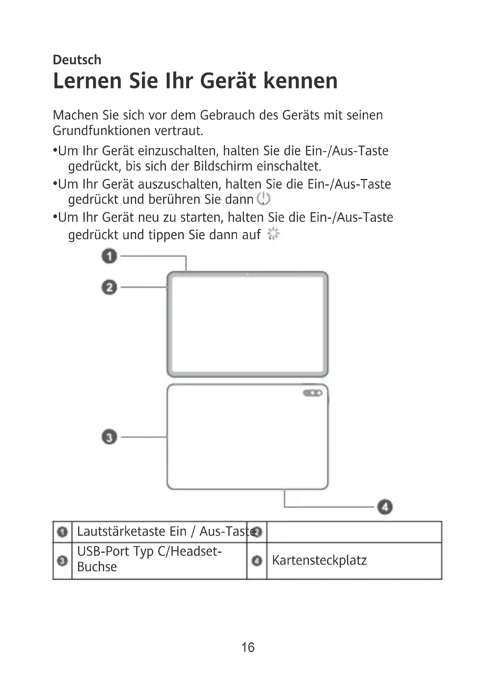 - Um Ihr Gerät neu zu starten, halten Sie die Ein-/Aus-Taste gedrückt und tippen Sie dann auf . Lautstärketaste Ein / Aus-Taste USB-Port Typ C/Headset- Buchse Kartensteckplatz 16Erste Schritte