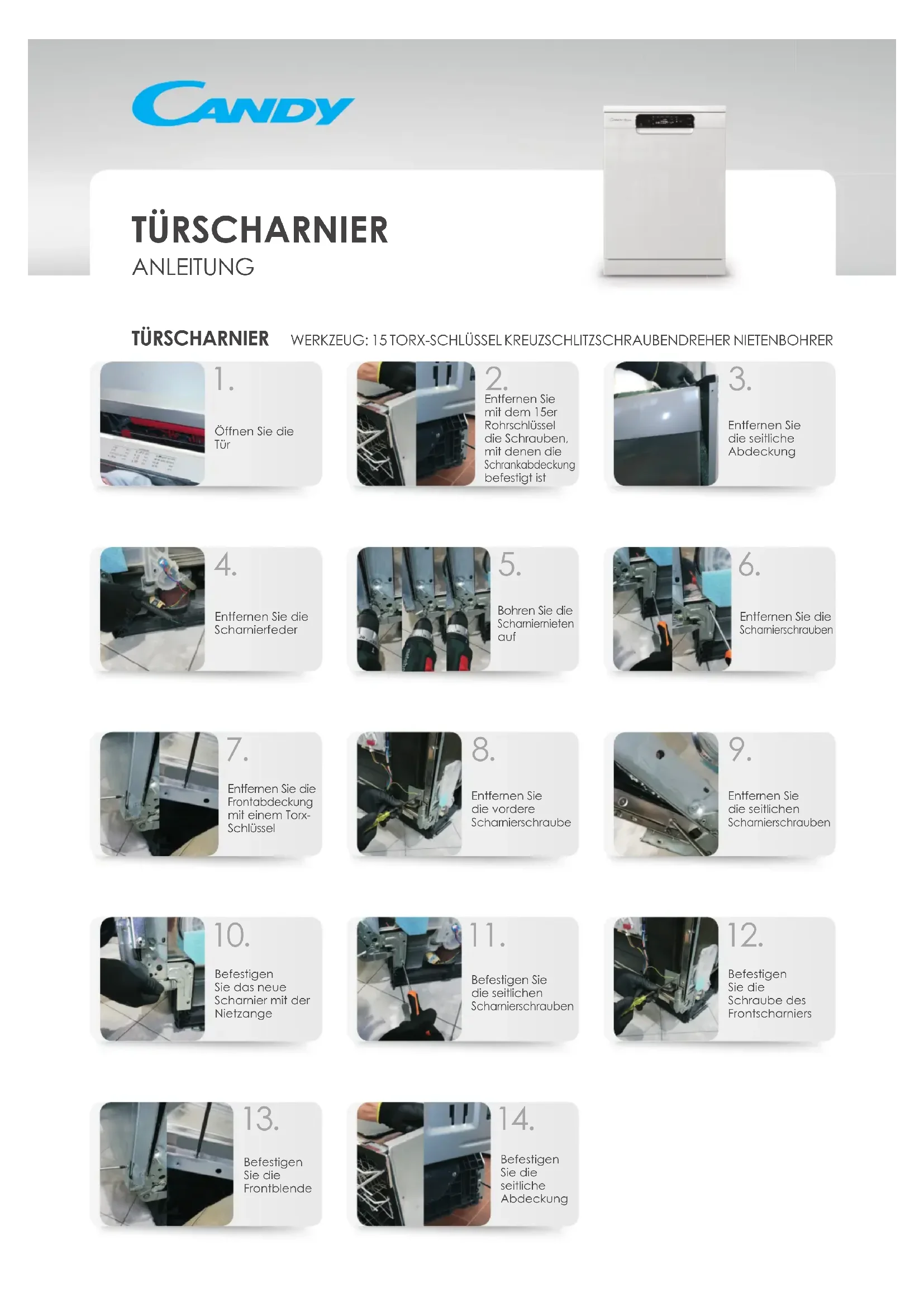 Befestigen Sie die seitlichen Scharnierschrauben Befestigen Sie die Schraube des Frontscharniers Befestigen Sie die Frontblende Befestigen Sie die seitliche Abdeckung TÜRSCHARNIER WERKZEUG: 15 TORX-SCHLÜSSEL KREUZSCHLITZSCHRAUBENDREHER NIETENBOHRER TÜRSCHARNIER ANLEITUNGÖffnen Sie die Tür