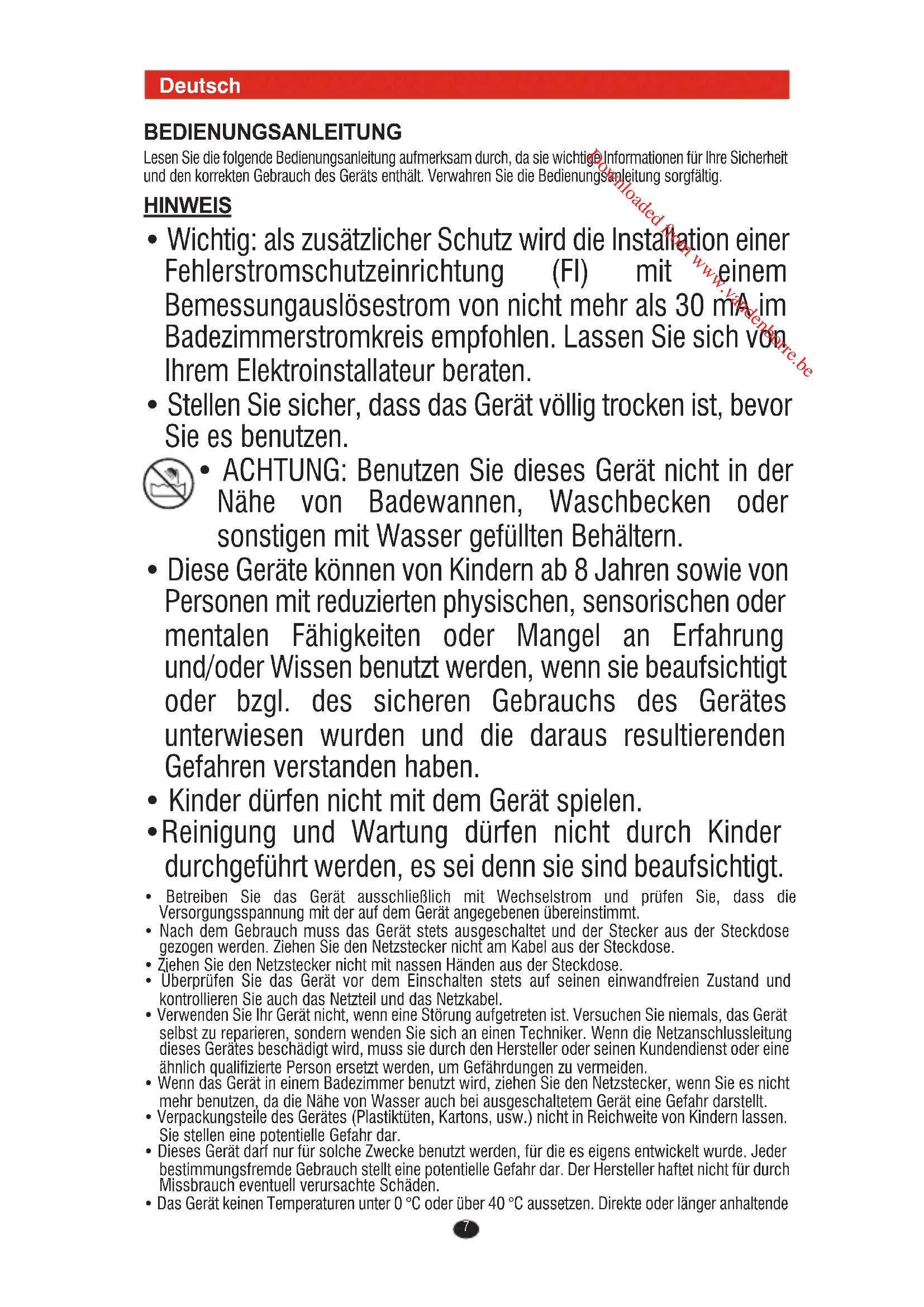 - Wichtig: als zusätzlicher Schutz wird die Installation einer Fehlerstromschutzeinrichtung (FI) mit einem Bemessungauslösestrom von nicht mehr als 30 mA im Badezimmerstromkreis empfohlen. Lassen Sie sich von Ihrem Elektroinstallateur beraten.