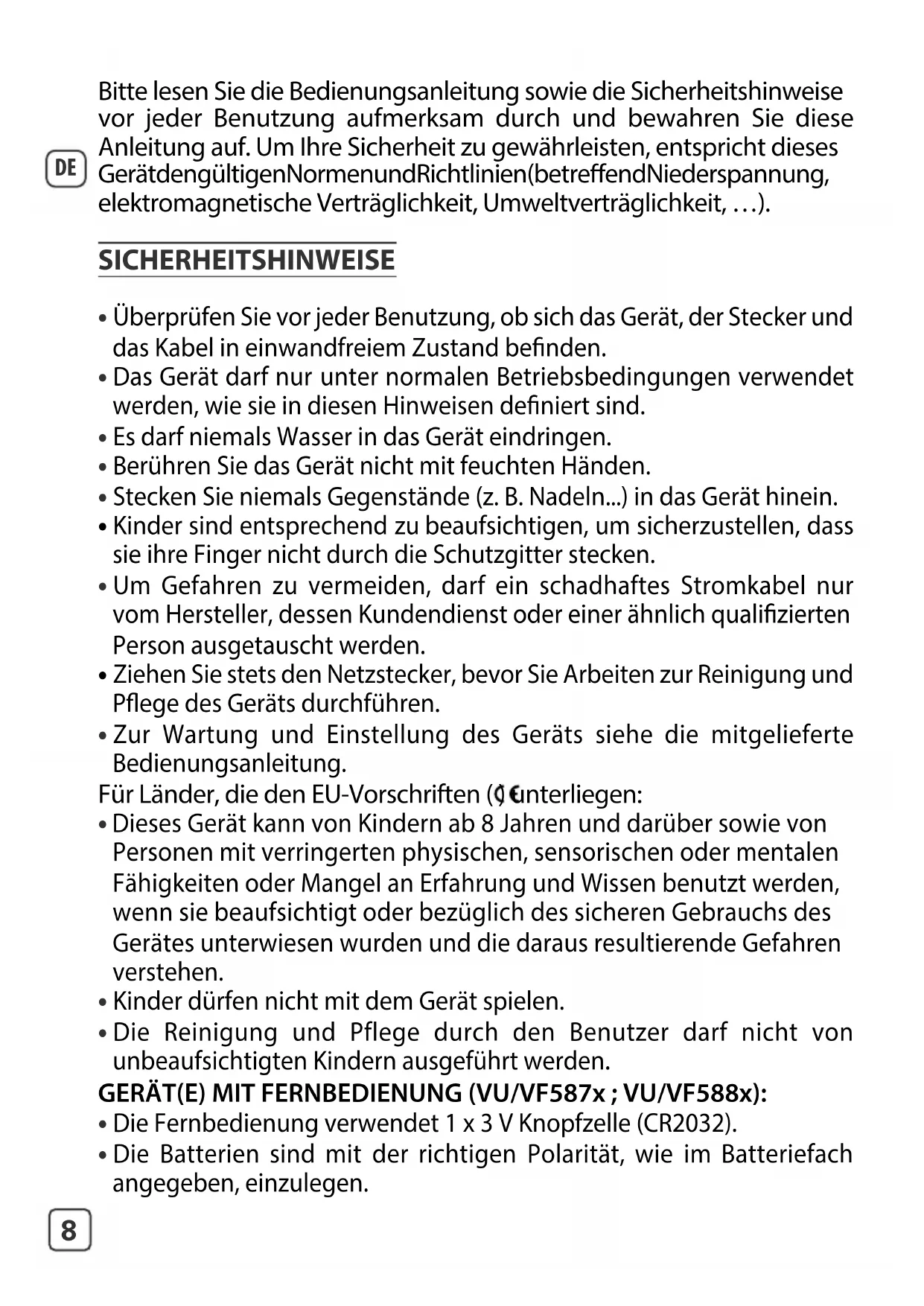 - Die Reinigung und Pflege durch den Benutzer darf nicht von unbeaufsichtigten Kindern ausgeführt werden. GERÄT(E) MIT FERNBEDIENUNG (VU/VF587x ; VU/VF588x):