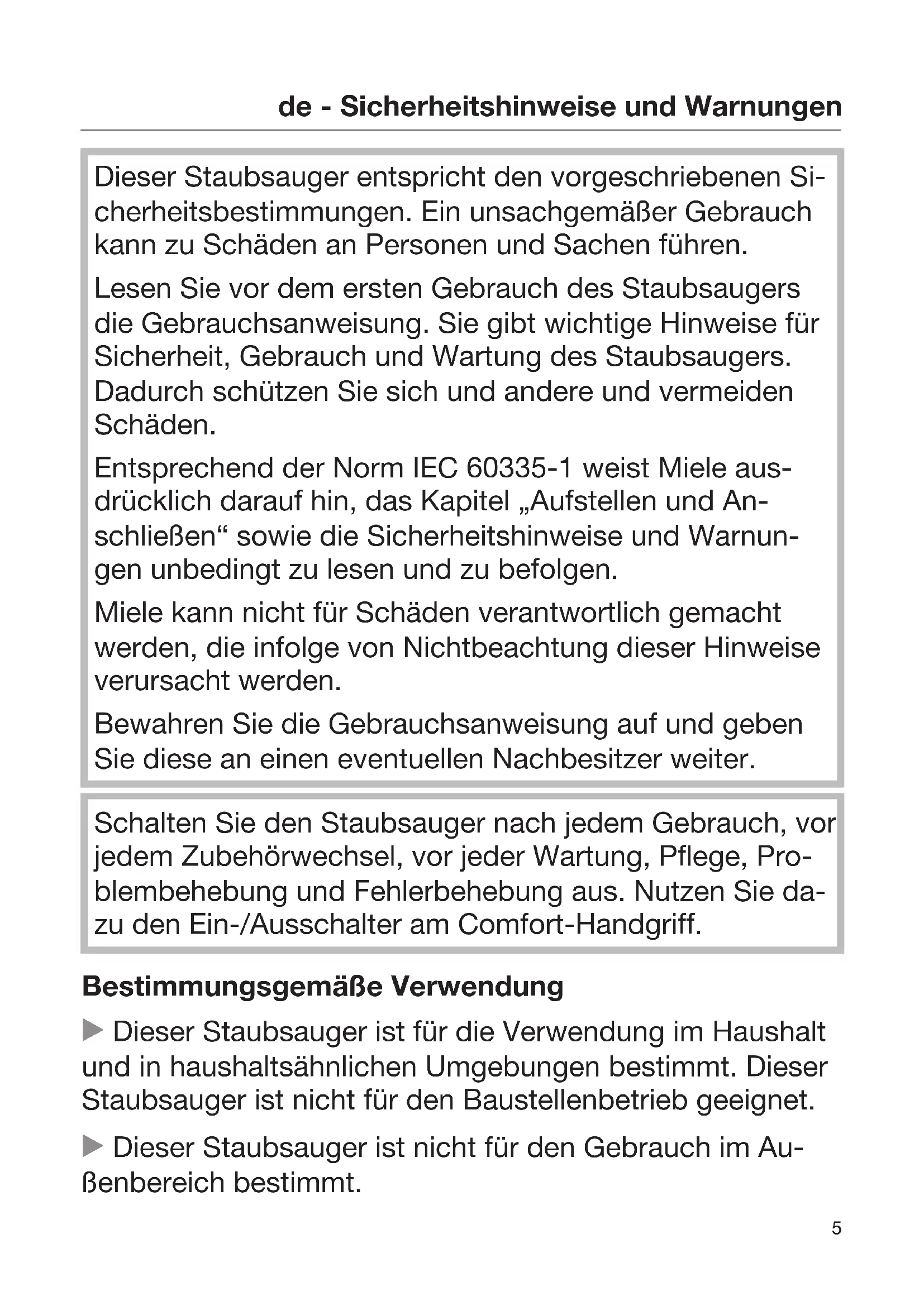 Dieser Staubsauger entspricht den vorgeschriebenen Si- cherheitsbestimmungen. Ein unsachgemäßer Gebrauch kann zu Schäden an Personen und Sachen führen. Lesen Sie vor dem ersten Gebrauch des Staubsaugers die Gebrauchsanweisung. Sie gibt wichtige Hinweise für Sicherheit, Gebrauch und Wartung des Staubsaugers. Dadurch schützen Sie sich und andere und vermeiden Schäden. Entsprechend der Norm IEC 60335-1 weist Miele aus- drücklich darauf hin, das Kapitel „Aufstellen und An- schließen“ sowie die Sicherheitshinweise und Warnun- gen unbedingt zu lesen und zu befolgen. Miele kann nicht für Schäden verantwortlich gemacht werden, die infolge von Nichtbeachtung dieser Hinweise verursacht werden. Bewahren Sie die Gebrauchsanweisung auf und geben Sie diese an einen eventuellen Nachbesitzer weiter. Schalten Sie den Staubsauger nach jedem Gebrauch, vor jedem Zubehörwechsel, vor jeder Wartung, Pflege, Pro- blembehebung und Fehlerbehebung aus. Nutzen Sie da- zu den Ein-/Ausschalter am Comfort-Handgriff. Bestimmungsgemäße Verwendung Dieser Staubsauger ist für die Verwendung im Haushalt und in haushaltsähnlichen Umgebungen bestimmt. Dieser Staubsauger ist nicht für den Baustellenbetrieb geeignet. Dieser Staubsauger ist nicht für den Gebrauch im Au- ßenbereich bestimmt.de - Sicherheitshinweise und Warnungen
