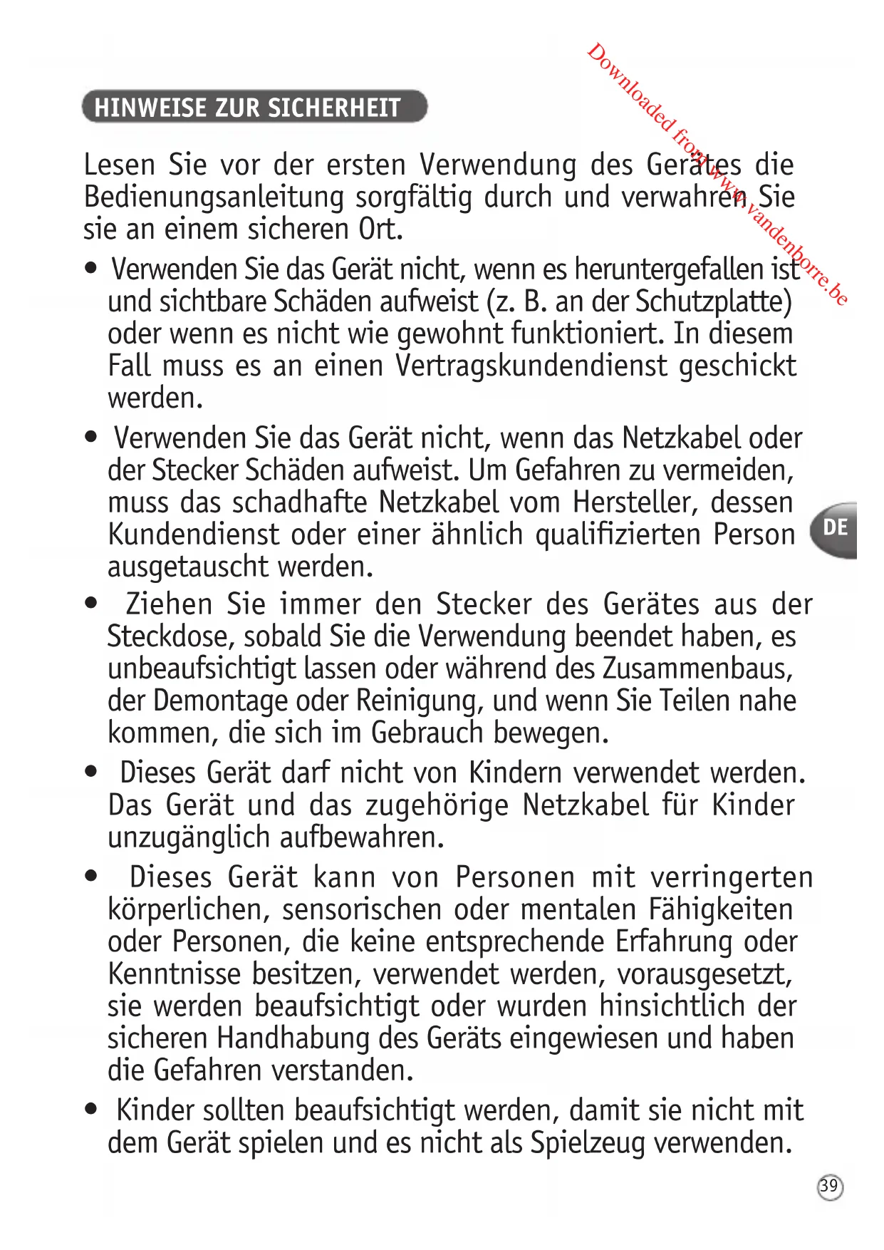 Downloaded from www.vandenborre.be• Dieses Gerät ist nicht zur Handhabung durch Personen mit eingeschränkten körperlichen, sensorischen oder geistigen Fähigkeiten oder durch Personen mit mangelnder Erfahrung bzw. mangelnden Kenntnissen vorgesehen, es sei denn unter Aufsicht einer Person, die für ihre Sicherheit verantwortlich ist und die vorab Anweisungen zur Handhabung des Gerätes gegeben hat.