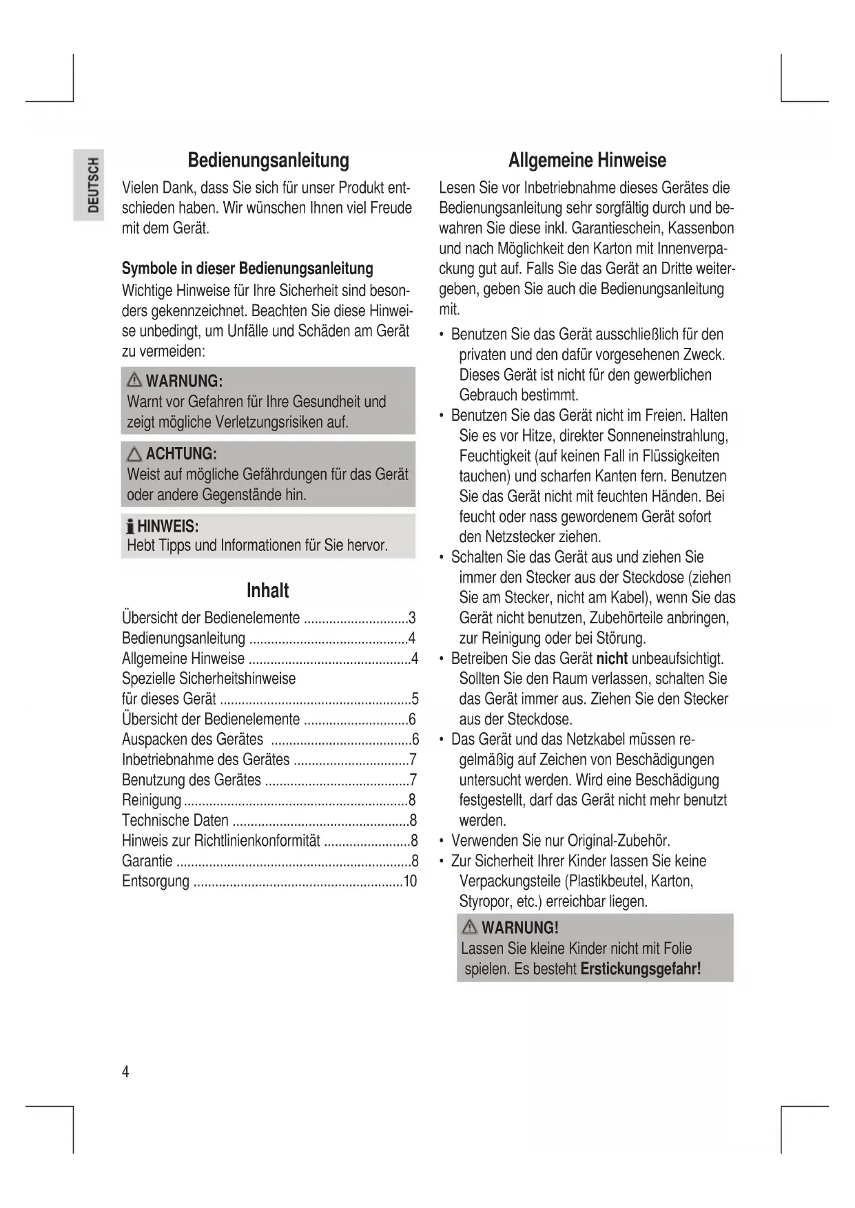 - Entsorgung Allgemeine Hinweise Lesen Sie vor Inbetriebnahme dieses Gerätes die Bedienungsanleitung sehr sorgfältig durch und be- wahren Sie diese inkl. Garantieschein, Kassenbon und nach Möglichkeit den Karton mit Innenverpa- ckung gut auf. Falls Sie das Gerät an Dritte weiter- geben, geben Sie auch die Bedienungsanleitung mit. p. 10