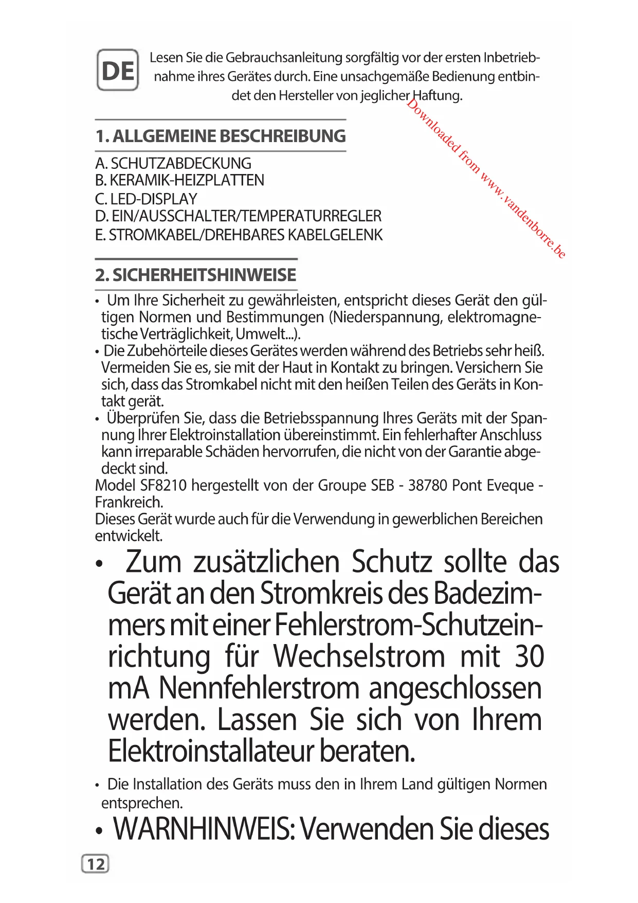- Überprüfen Sie, dass die Betriebsspannung Ihres Geräts mit der Span- nung Ihrer Elektroinstallation übereinstimmt. Ein fehlerhafter Anschluss kann irreparable Schäden hervorrufen, die nicht von der Garantie abge- deckt sind. Model SF8210 hergestellt von der Groupe SEB - 38780 Pont Eveque - Frankreich. Dieses Gerät wurde auch für die Verwendung in gewerblichen Bereichen entwickelt.