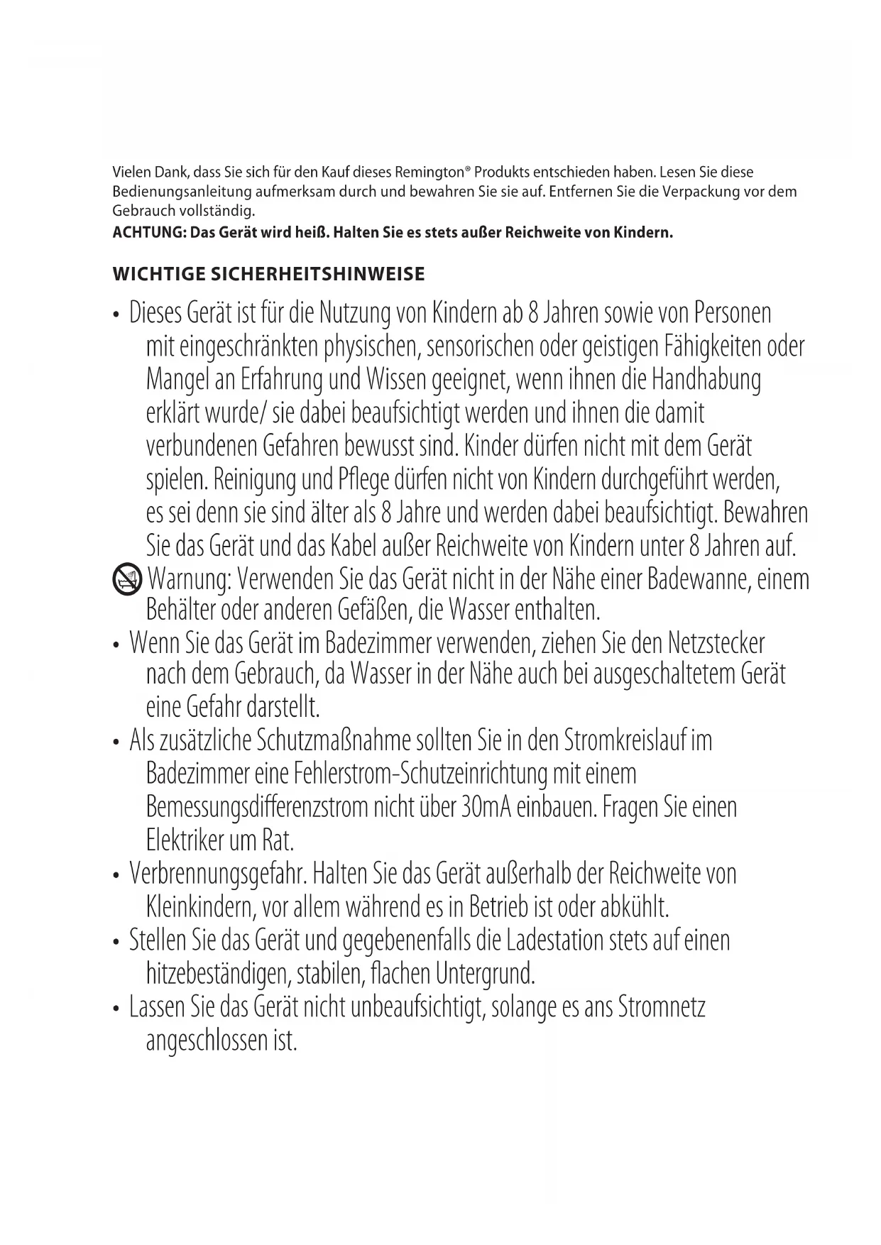 To avoid environmental and health problems due to hazardous substances, appliances and rechargeable and non-rechargeable batteries marked with one of these symbols must not be disposed of with unsorted municipal waste. Always dispose of electrical and electronic products and, where applicable, rechargeable and non-rechargeable batteries, at an appropriate ocial recycling/collection point.6 DEUTSCH Vielen Dank, dass Sie sich für den Kauf dieses Remington® Produkts entschieden haben. Lesen Sie diese Bedienungsanleitung aufmerksam durch und bewahren Sie sie auf. Entfernen Sie die Verpackung vor dem Gebrauch vollständig. ACHTUNG: Das Gerät wird heiß. Halten Sie es stets außer Reichweite von Kindern. WICHTIGE SICHERHEITSHINWEISE