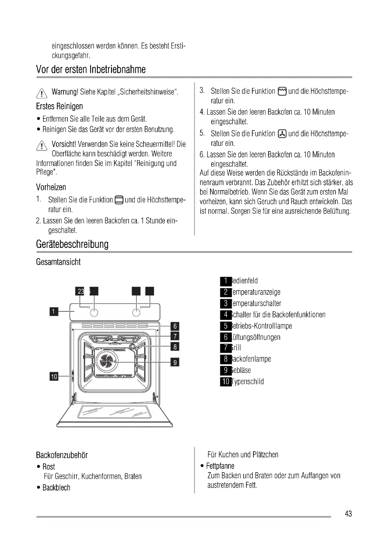 eingeschaltet. Auf diese Weise werden die Rückstände im Backofenin- nenraum verbrannt. Das Zubehör erhitzt sich stärker, als bei Normalbetrieb. Wenn Sie das Gerät zum ersten Mal vorheizen, kann sich Geruch und Rauch entwickeln. Das ist normal. Sorgen Sie für eine ausreichende Belüftung. Gerätebeschreibung Gesamtansicht