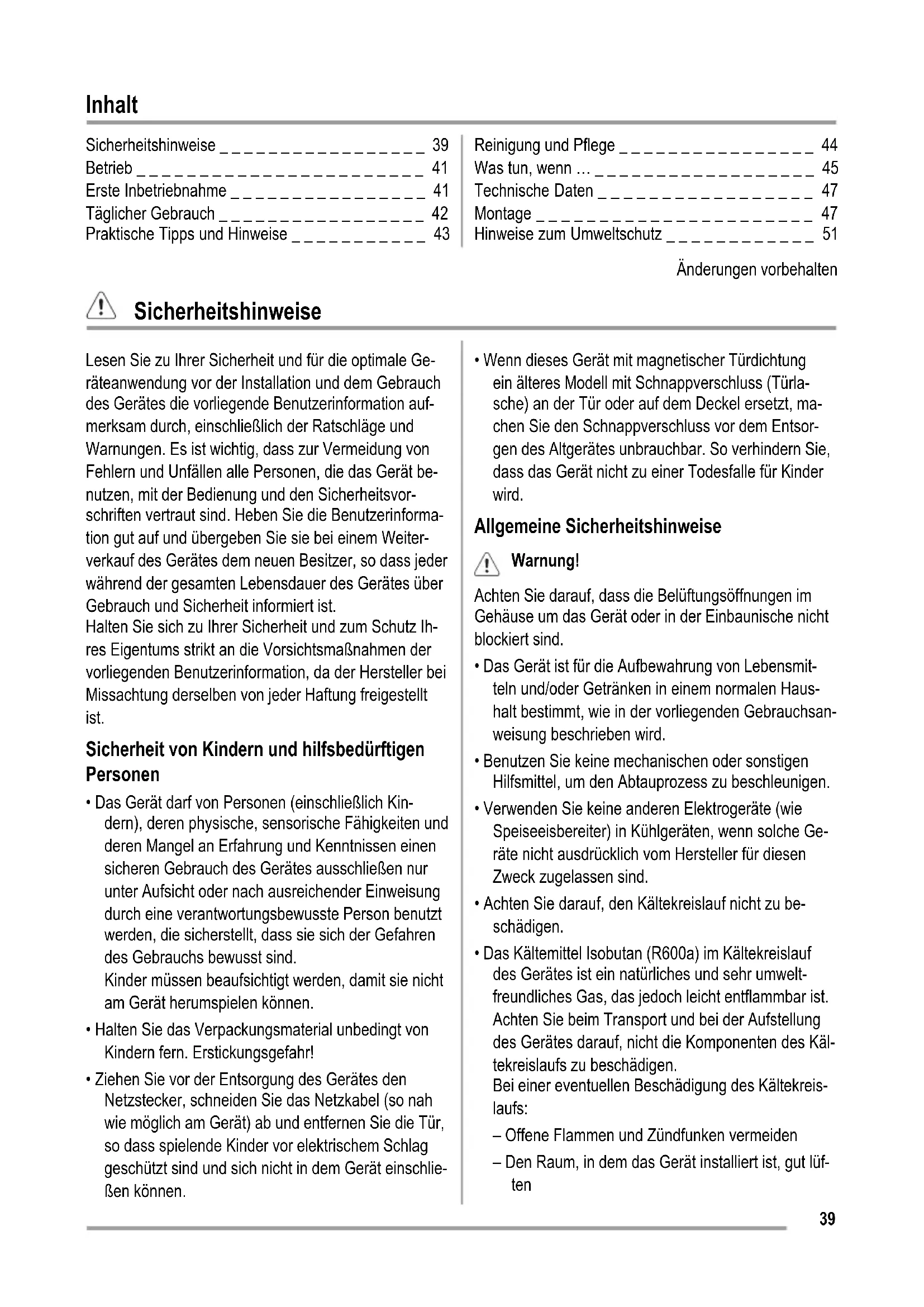 - Das Kältemittel Isobutan (R600a) im Kältekreislauf des Gerätes ist ein natürliches und sehr umwelt- freundliches Gas, das jedoch leicht entflammbar ist. Achten Sie beim Transport und bei der Aufstellung des Gerätes darauf, nicht die Komponenten des Käl- tekreislaufs zu beschädigen. Bei einer eventuellen Beschädigung des Kältekreis- laufs: – Offene Flammen und Zündfunken vermeiden – Den Raum, in dem das Gerät installiert ist, gut lüf- ten 39• Technische und anderweitige Änderungen am Gerät sind gefährlich. Ein defektes Netzkabel kann Kurz- schlüsse und einen Brand verursachen und/oder zu Stromschlägen führen. Warnung! Elektrische Bauteile (Netzkabel, Ste- cker, Kompressor) dürfen zur Vermeidung von Gefahren nur vom Kundendienst oder einer Fachkraft ausgewechselt werden.