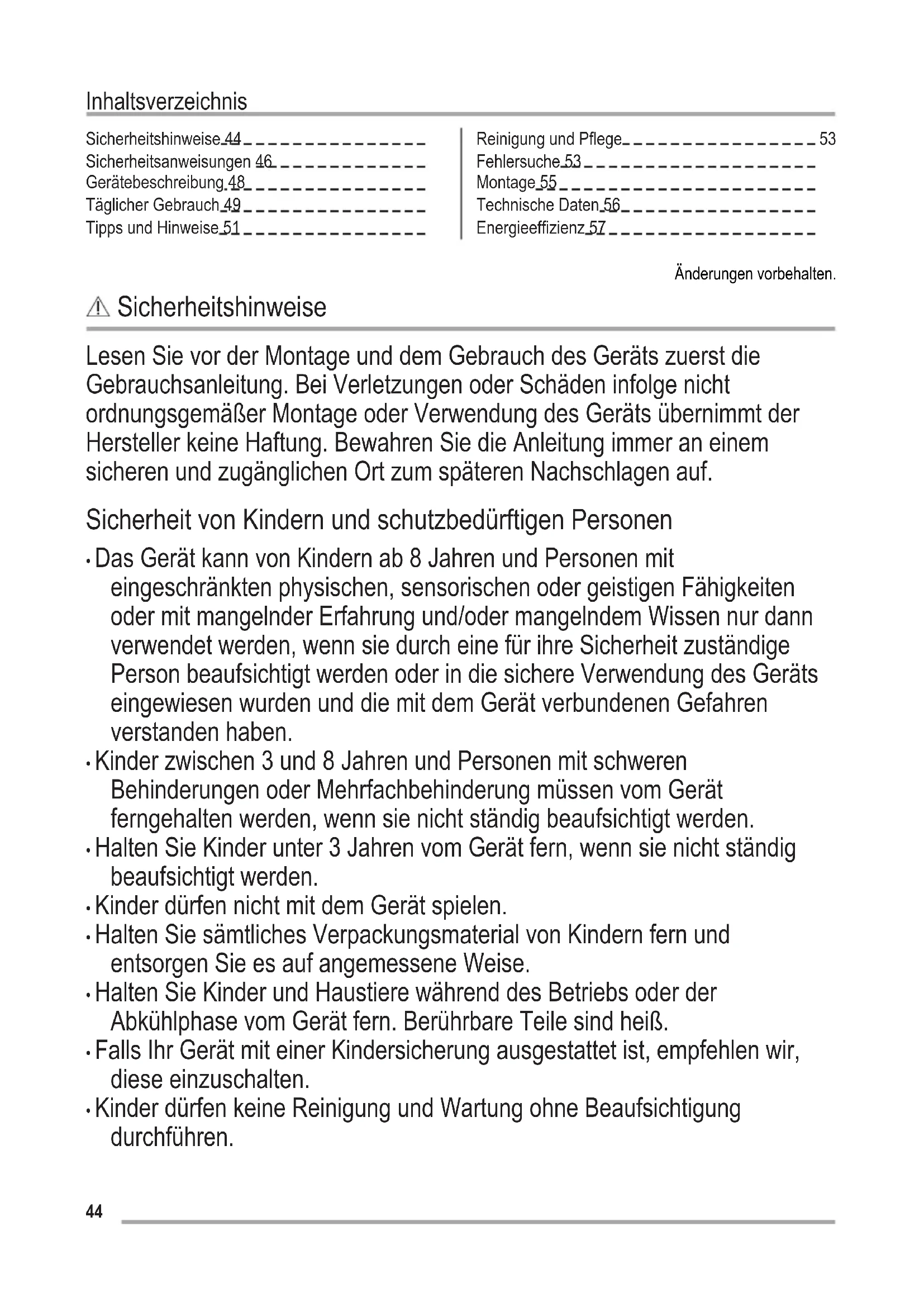 Fehlersuche 53 Montage 55 Technische Daten 56 Energieeffizienz 57 Änderungen vorbehalten. Sicherheitshinweise Lesen Sie vor der Montage und dem Gebrauch des Geräts zuerst die Gebrauchsanleitung. Bei Verletzungen oder Schäden infolge nicht ordnungsgemäßer Montage oder Verwendung des Geräts übernimmt der Hersteller keine Haftung. Bewahren Sie die Anleitung immer an einem sicheren und zugänglichen Ort zum späteren Nachschlagen auf. Sicherheit von Kindern und schutzbedürftigen Personen