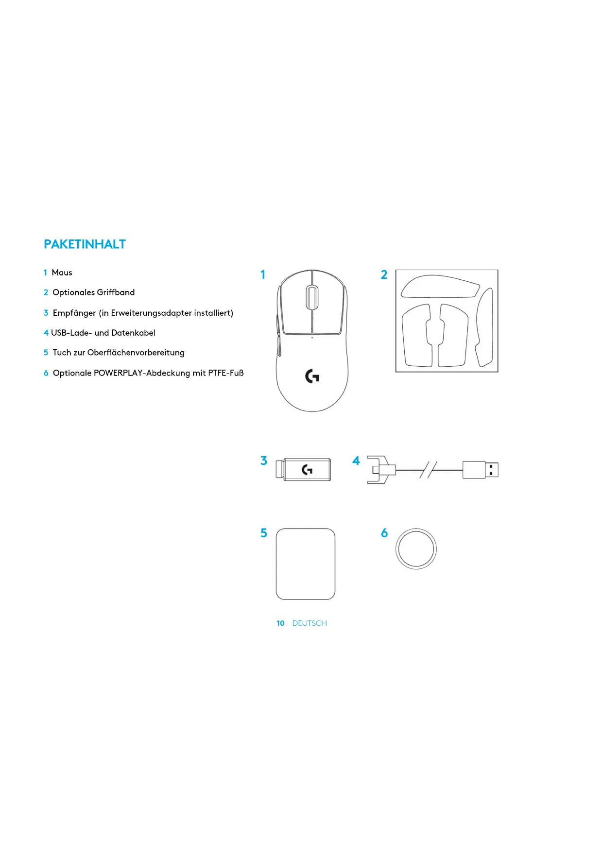 logitechG.com/ghub14 DEUTSCH > 2 m ~ 20 cm Für eine optimale kabellose Leistung sollten Sie die Maus aus höchstens 20 cm Entfernung vom Empfänger und mehr als 2 m entfernt von 2,4 GHz-Interferenzquellen (wie z. B. WLAN-Router) verwenden.15 DEUTSCH Zum Anbringen des optionalen Gribandes reinigen Sie dieOberäche der Maus zunächst mit dem mitgelieferten Tuch zurOberächenvorbereitung, um Öl oder Staub zu entfernen. Richten Sie dann das Griband an der Mausoberäche aus. 1 216 DEUTSCH Der USB-Empfänger lässt sich durch Abnehmen der POWERPLAY-Abdeckung in derMaus verstauen. Dadurch wird verhindert, dass der Empfänger beiderVerwendung der Maus mit dem kabellosen Logitech G POWERPLAY- Ladesystemverloren geht. Durch das Entfernen dieser Abdeckung kann sie auch durch die mitgelieferte Abdeckung mit PTFE-Fuß ersetzt werden.